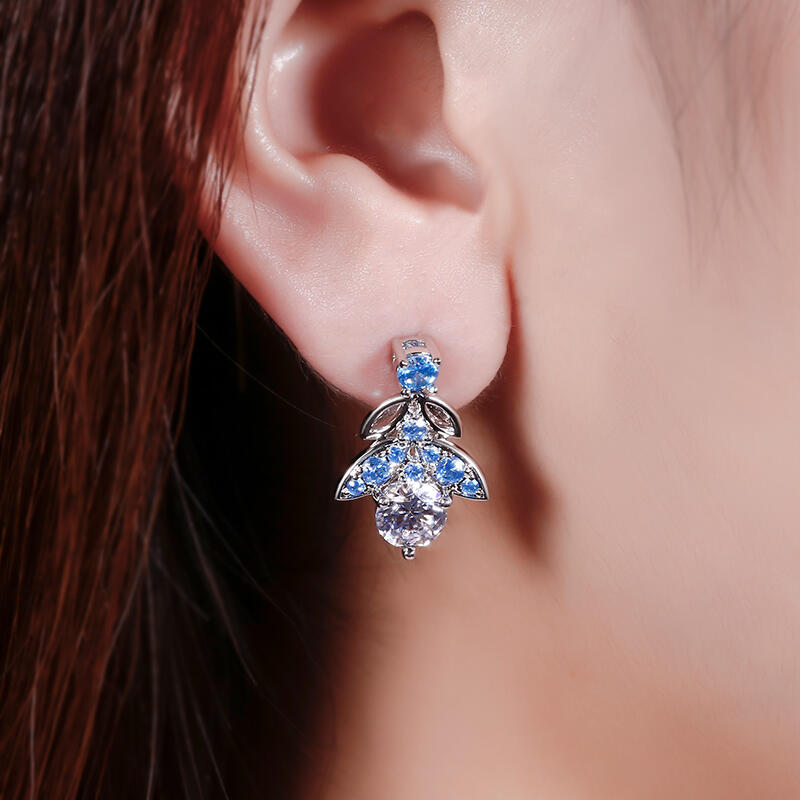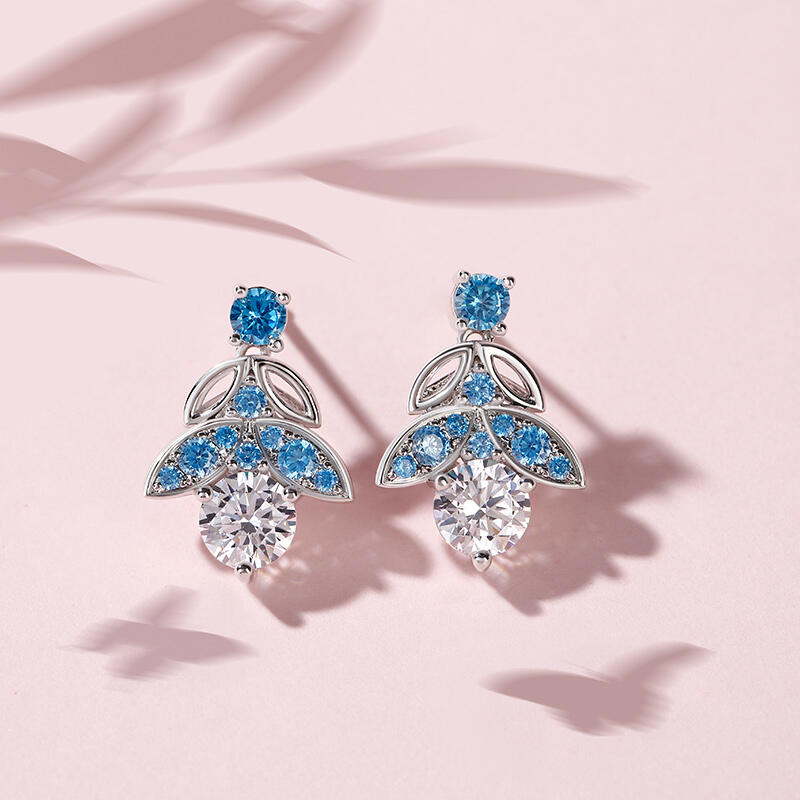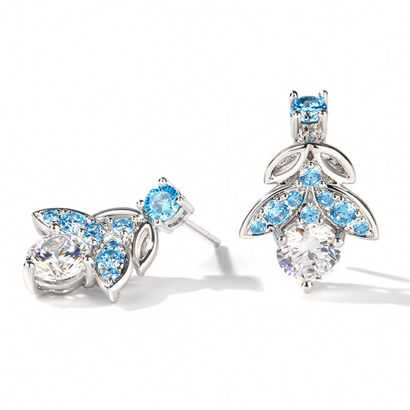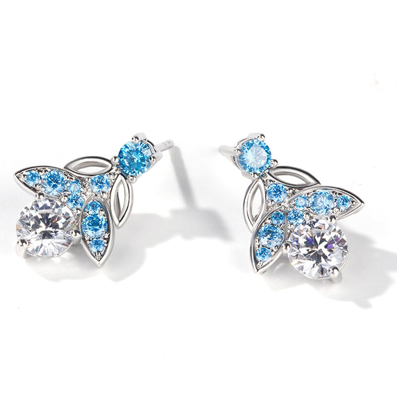Glistening and glamorous, these earrings will win your heart. Crafted in sterling silver, each feature a shimmering round cut center stone wrapped in sparkling blue stones, bringing out it's beauty and sparkle. Additional stones form butterfly shaped design to add more elegance to these earrings. These earrings are splendid choice you are sure to adore.