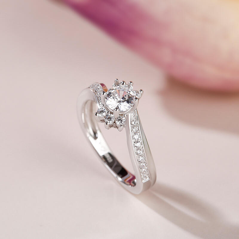 Unique and beautiful, this modern-look ring will capture your heart at first sight! Crafted in sterling silver, the engagement ring features a glistening round center stone accented with six little round stones. With all the glistening stones, the ring will show a really sparkling look on your finger. Never miss it.