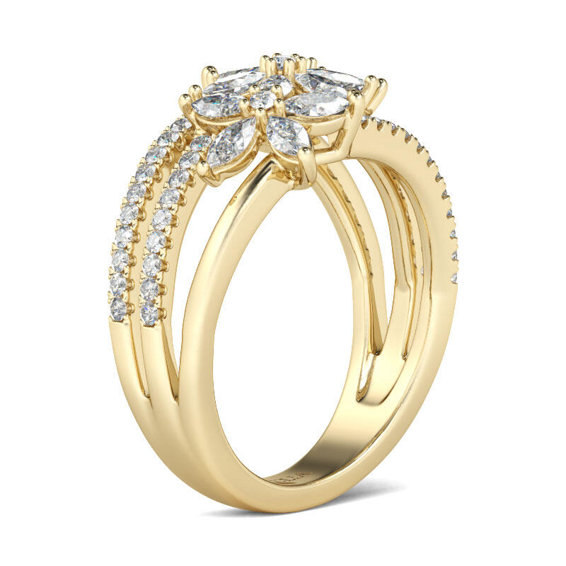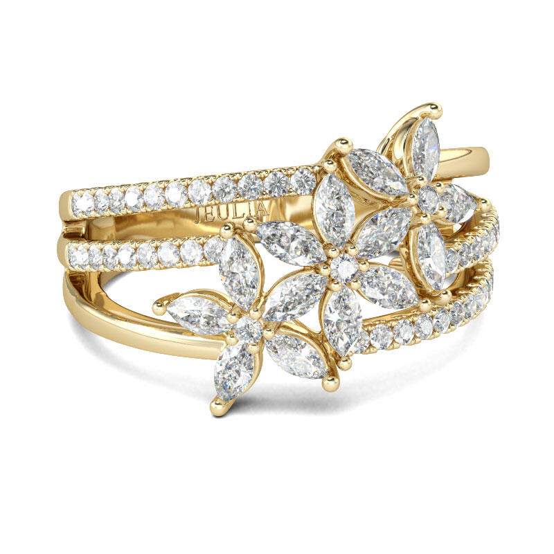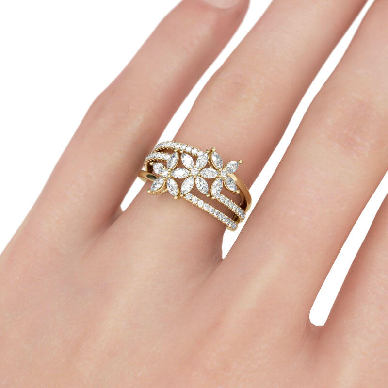 Stunning and sparkling, this flower ring will take your breath away. Flower is one of the most popular motifs in jewelry. It's often related with beauty,vitality and happiness, like your love. This flower ring showcases three flowers with glistening marquise-cut stones on the petals. Along the split shank, shimmering small stones are set to add extra sparkle to the ring. Treat yourself or surprise her with this delicate piece.