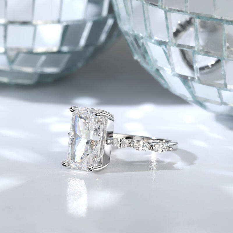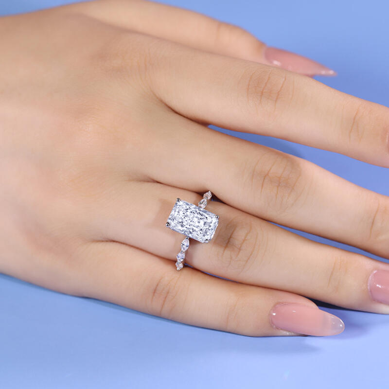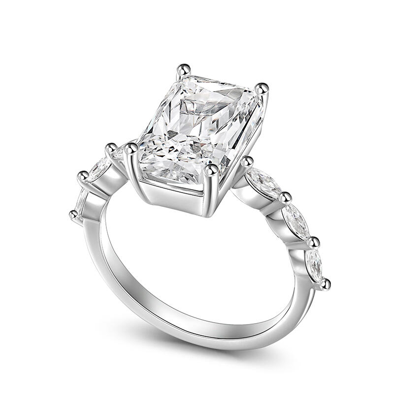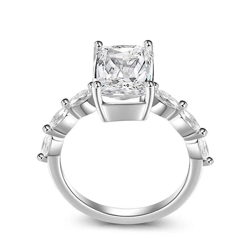 Witness the beginning of your life together with this sparkling engagement ring. Crafted in sterling silver, this exquisite engagement ring features a sparkling emerald-shaped stone in the centre. Six marquise-cut stones sparkle on the polished shank, creating an elegant and sparkling look. Stunning in its simplicity, this ring is sure to become a cherished favourite.