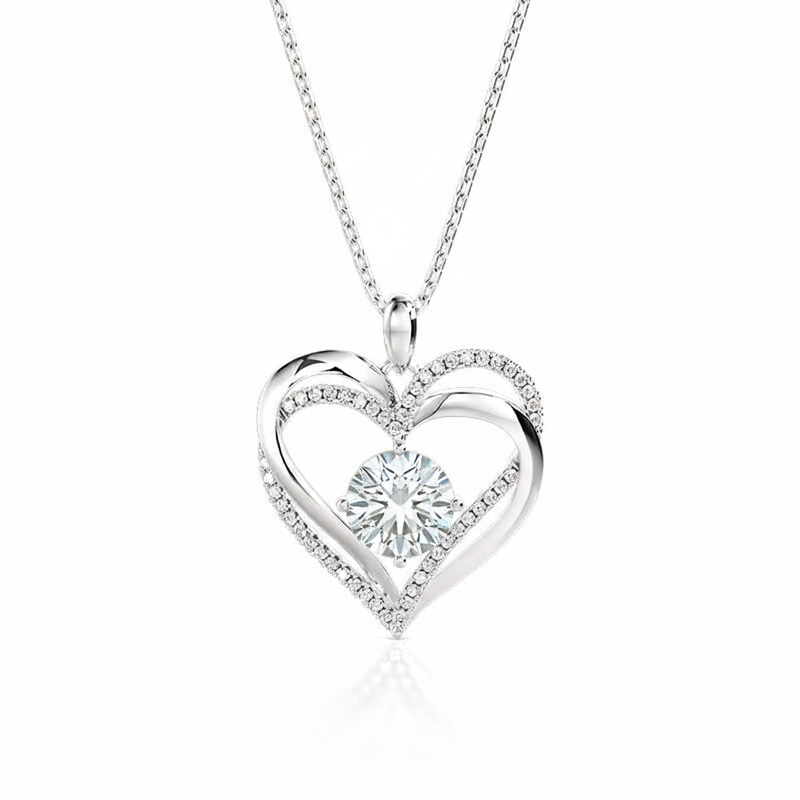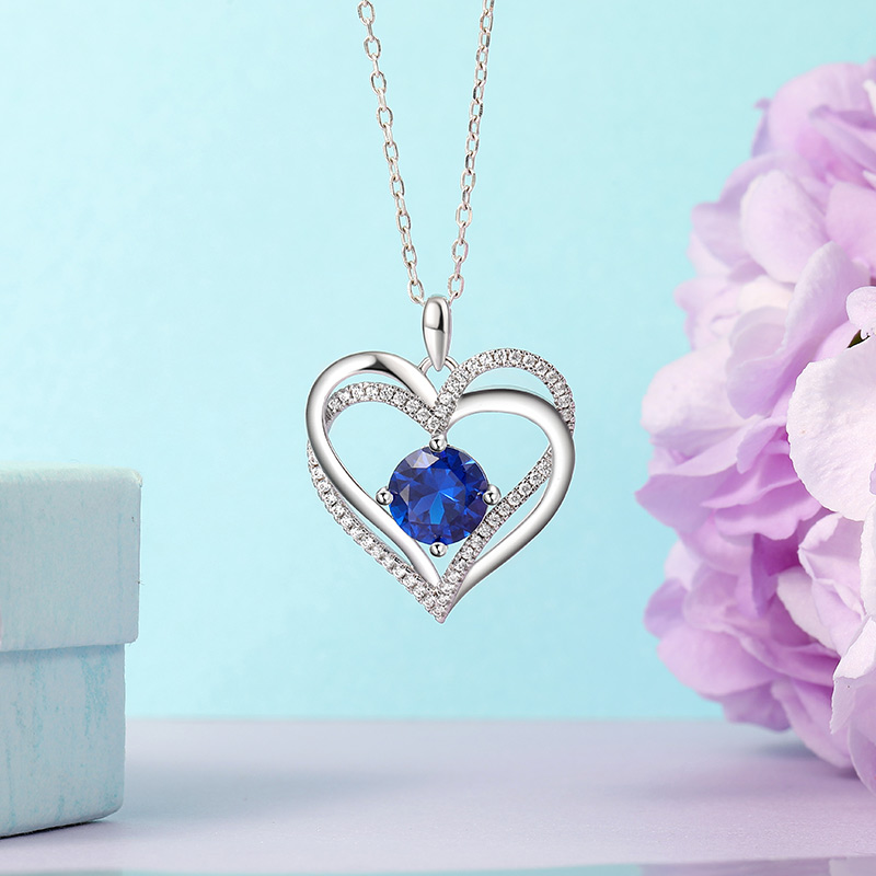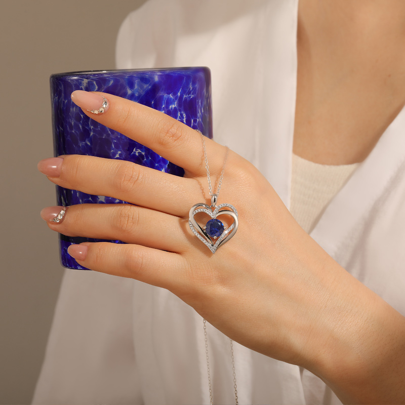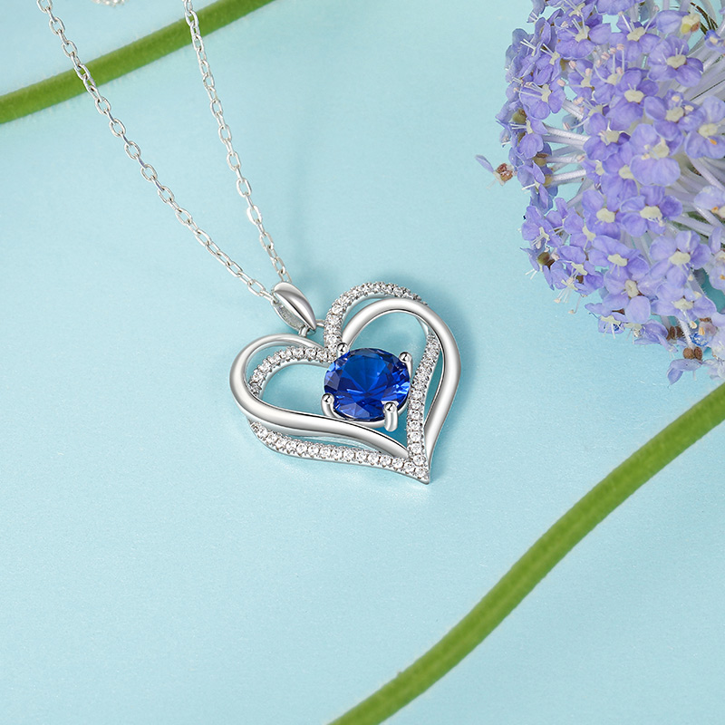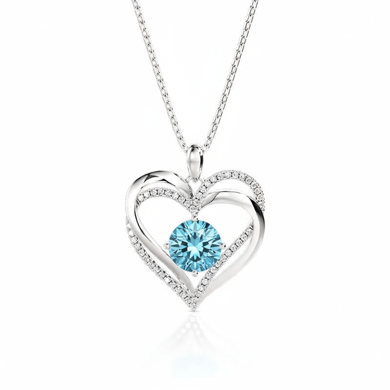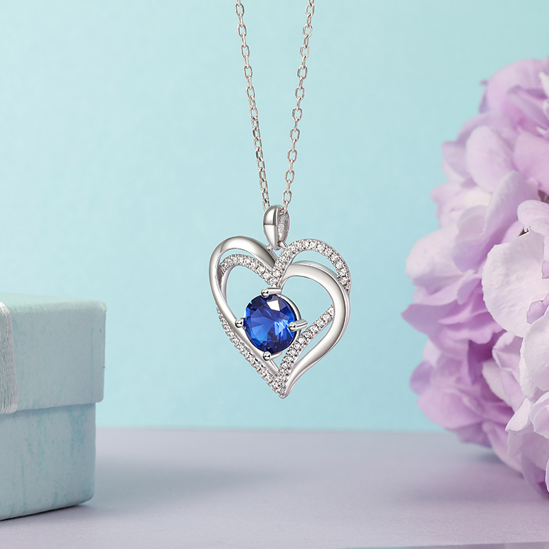 This custom double heart necklace presents a highly romantic design. The body of the classic necklace consists of two interlocking hearts, symbolizing eternal love. A sparkling blue gemstone is set in the center and surrounded by delicate crystals, adding a sense of luxury. The overall design of this custom birthstone necklace is not only elegant and graceful, but it can also be customized with colors to suit your personal preferences, making it perfect for expressing love and precious emotions. Ideal for a special her as a holiday or anniversary gift.