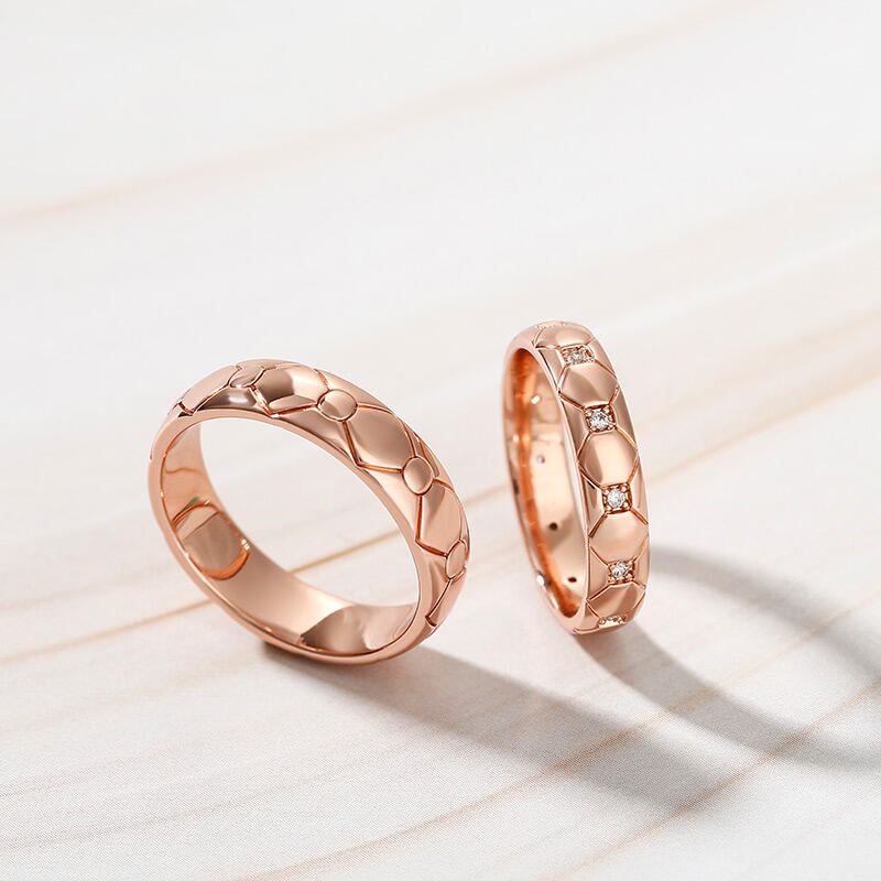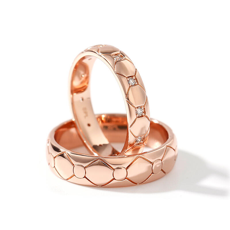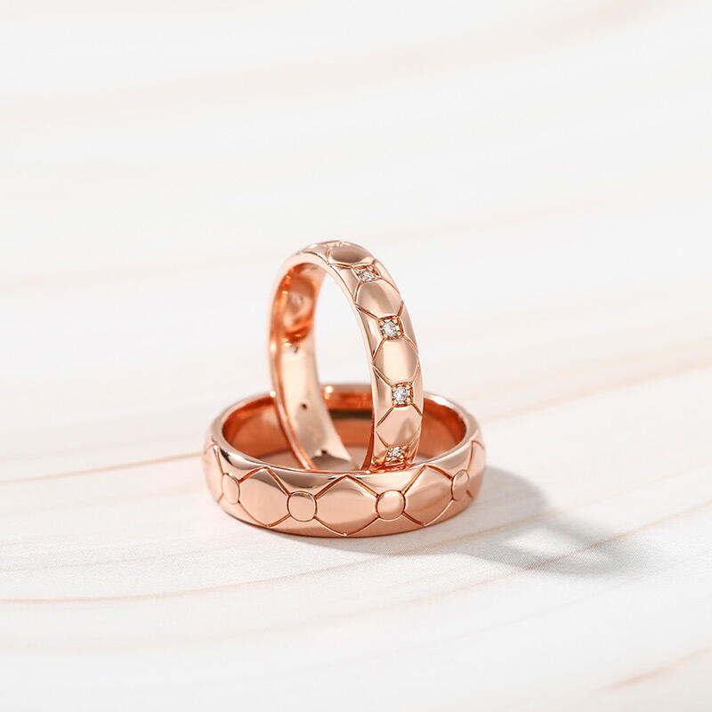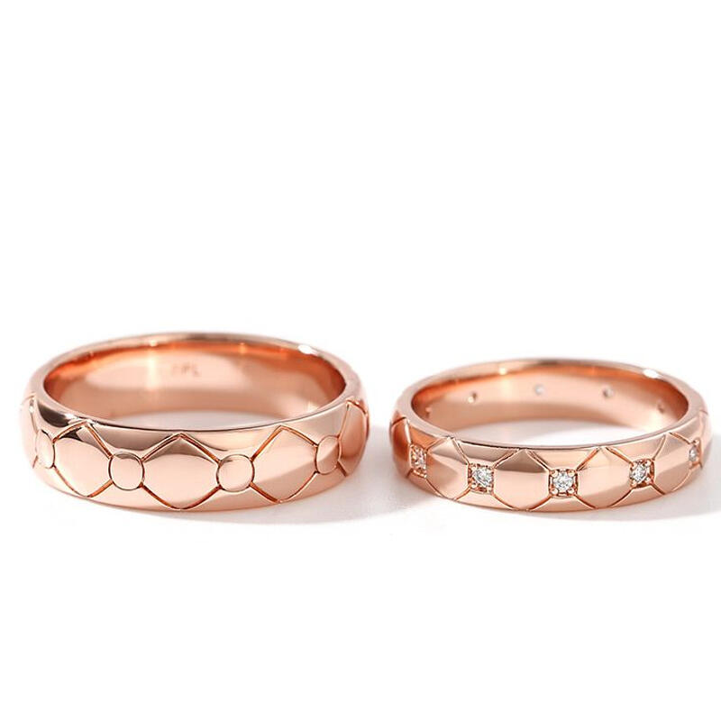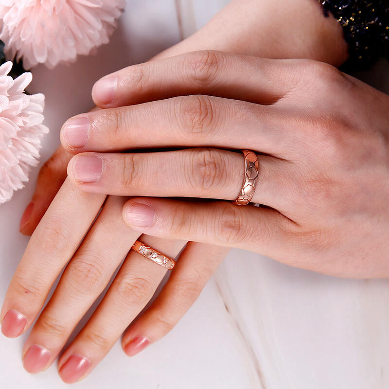 Pledge your love with this pair of couple rings. Crafted in rose gold tone sterling silver, the women's ring is set with sparking round stones, while lined design makes the ring more unique. The men's ring is a simple lined design. This pair of rings makes an adorable gift for couples. Never miss it.