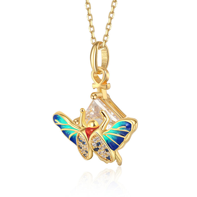 Inspired by ancient Egyptian culture, this saint beetle enamel necklace is a perfect blend of mystery and elegance. The Sacred Beetle, enameled in gradient blue with vibrant colors, lies on a white stone in the shape of a pyramid, symbolizing life and rebirth. The geometric lines of the pyramid are mirrored by the curves of the beetle, creating a unique design aesthetic. The clasp head of the colorful necklace is adorned with the ankh symbol, signifying protection and eternity, bringing new life and strength to the wearer. Whether worn daily or as a talisman, this colorful ankh enamel necklace adds a mysterious charm and guardian energy. Wear it and let the ancient powers protect you every day!