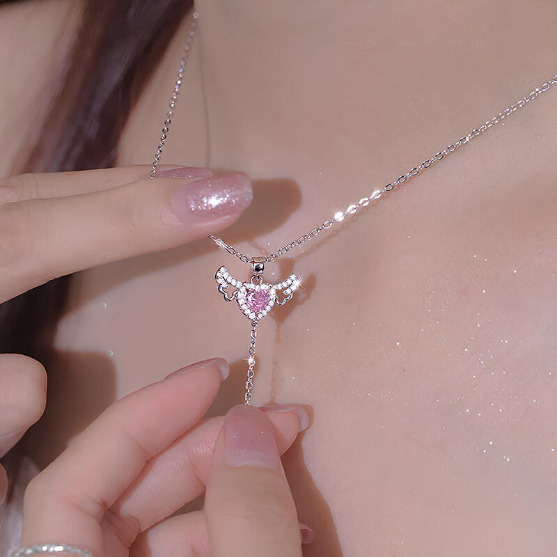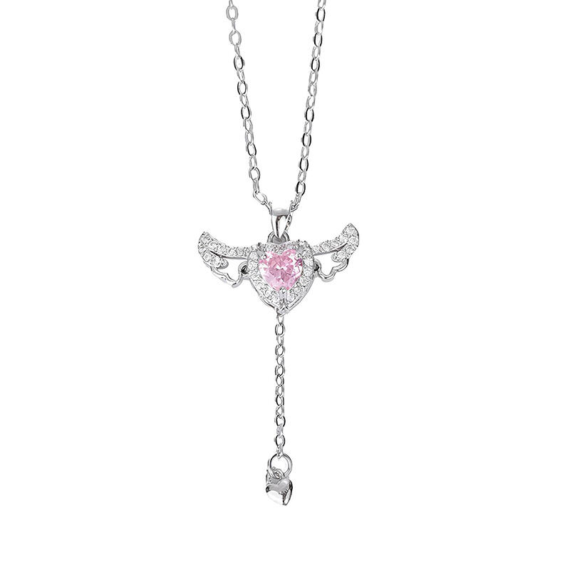 This flying angel's wing heart necklace is designed in the style of Cupid's Love, the main stone in the middle is a pink heart cut stone, and the two sides are set with white stones to form the shape of wings. It is made of sterling silver and has a unique heart and wing design. This pink heart necklace is the most suitable for you in love, so that your lover can express the hot love. Pull the tail of heart and the angel's wing will flying in the pink heart necklace.