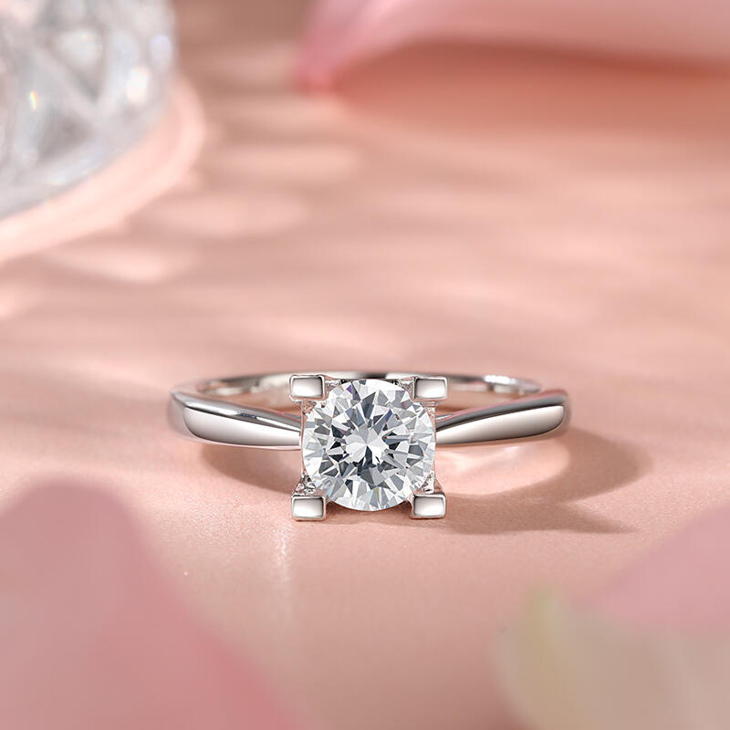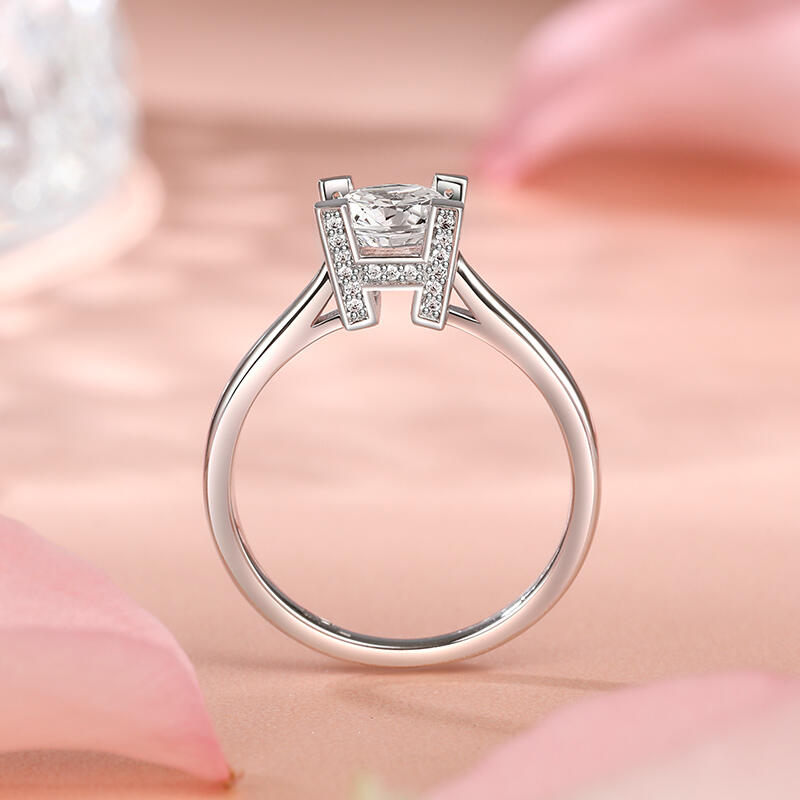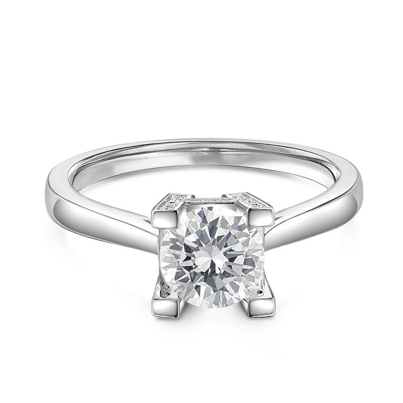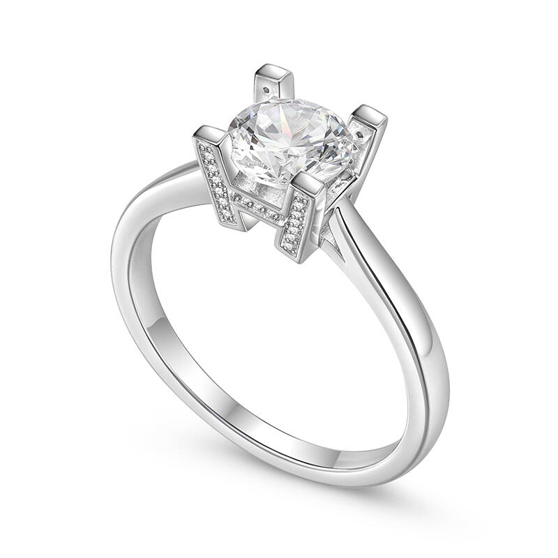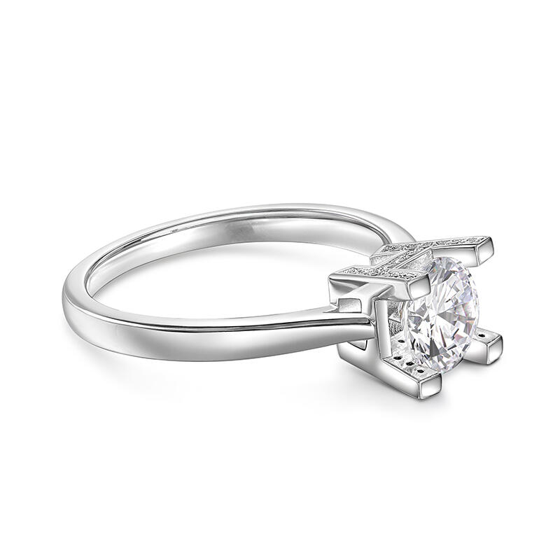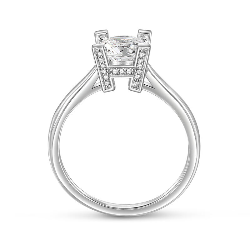 In the center of this ring lies a round cut center stone that sparkles with unparalleled brilliance. This stone is carefully flanked by two smaller, shiny stones that are intricately shaped to form the letter H, a symbol that represents love, harmony, and happiness. Its simple yet elegant design, coupled with its meaningful symbol, is sure to capture the hearts of all who behold it.