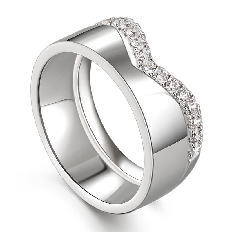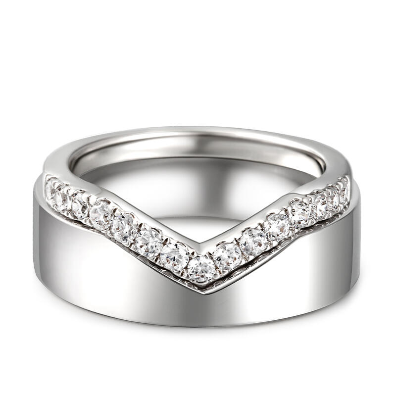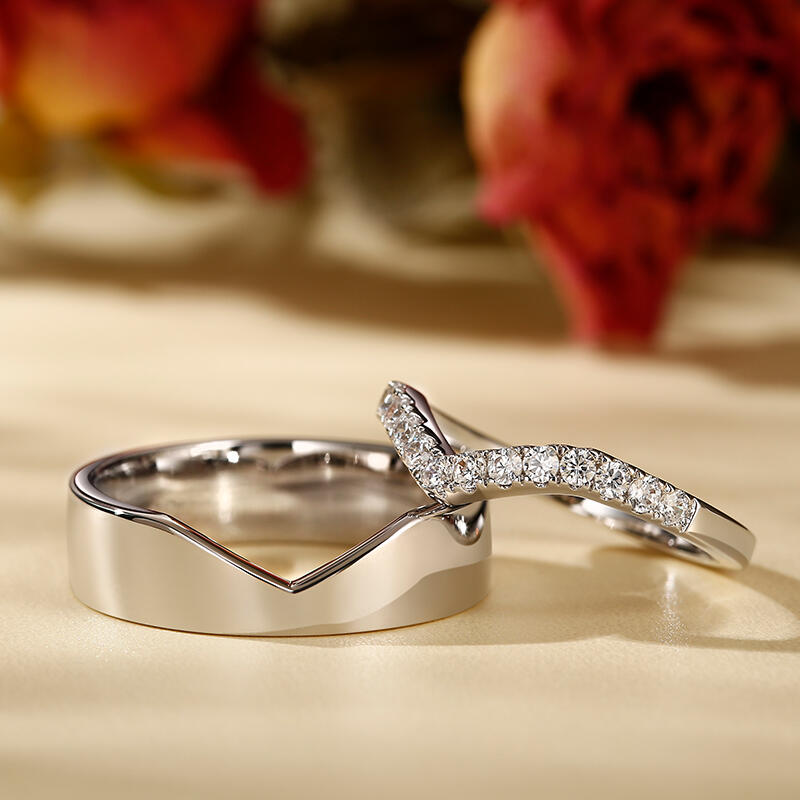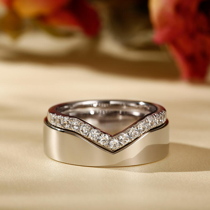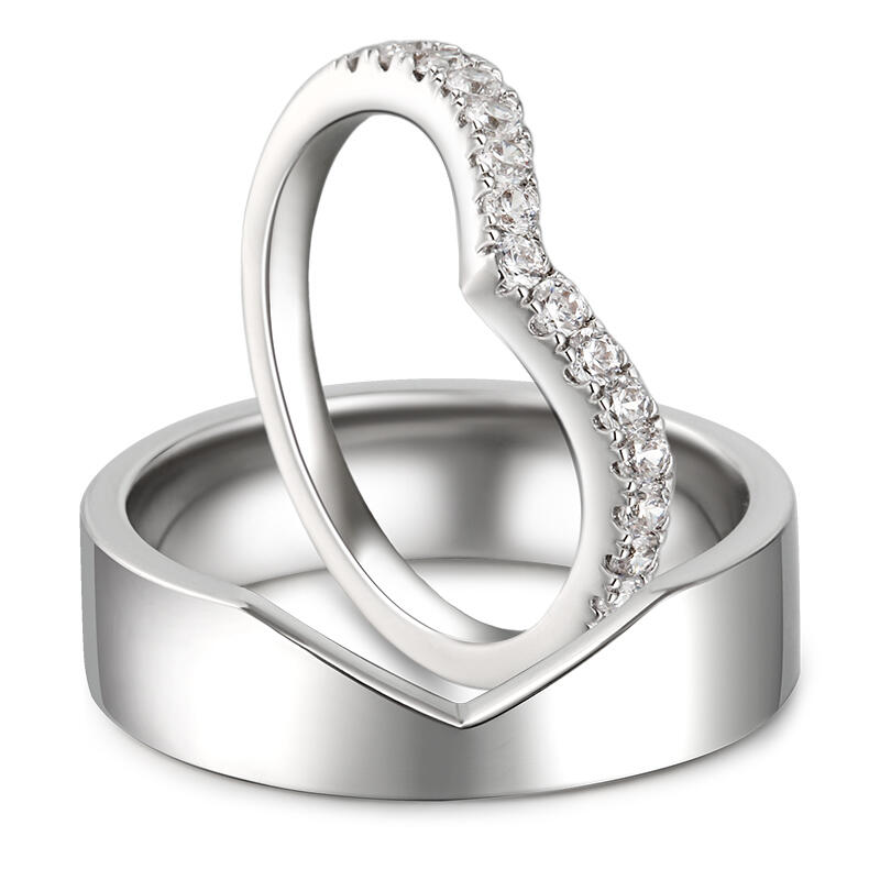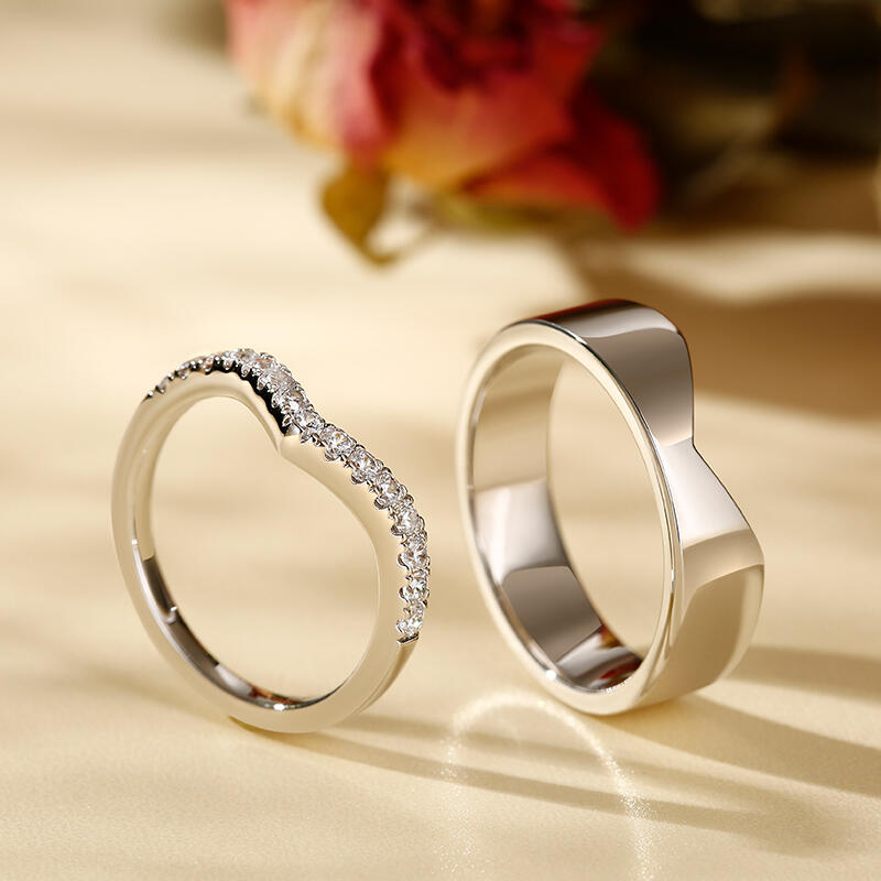 Simple yet delicate look of each band makes them a suitable gift for everyday wear while still expressing your deep commitment to each other. This band set is crafted in sterling silver, one of which is set with white stones. Never miss it.