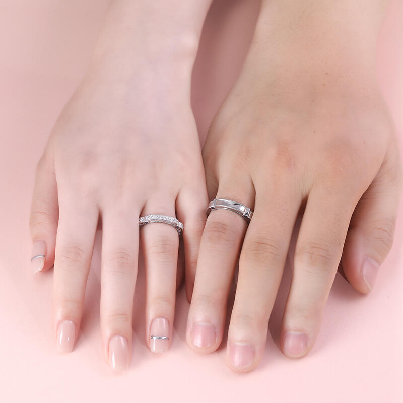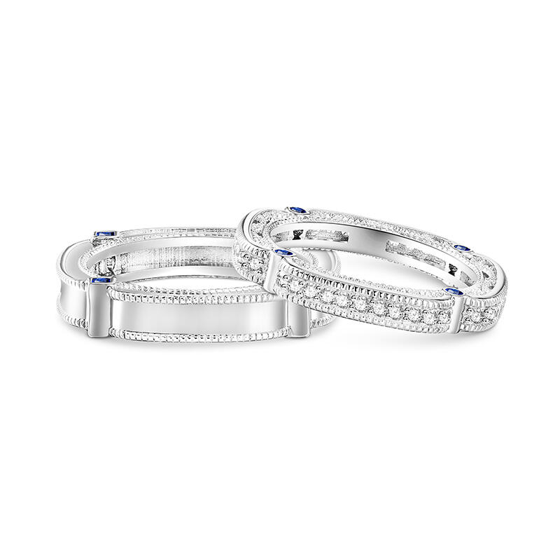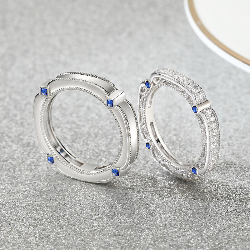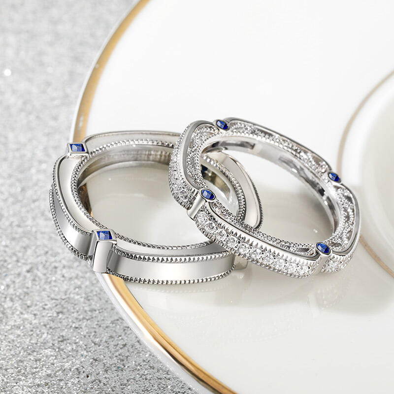 The lucky blue star vintage beaded scroll sterling silver wedding band is a pair of wedding bands that exude elegance and sophistication. As a wedding band, it carries deep significance, symbolizing unity and the unbreakable bond between two individuals—each scroll representing moments in their journey together. The 'lucky blue star' feature, often included as a charming accent, adds a layer of whimsy and hope, suggesting that love, much like the stars in the sky, is both rare and wondrous, illuminating the path ahead. Wearing this vintage beaded scrollwork ring is not just about aesthetic appeal; it becomes a cherished token of commitment, a piece of art that narrates the story of love, resilience, and shared dreams, destined to be passed down through generations as a lasting reminder of a couple's vows and the magic they create together. In a world where trends come and go, the Lucky Blue Star wedding band stands as a testament to enduring love, encapsulating both history and personal significance in its beautifully crafted form.