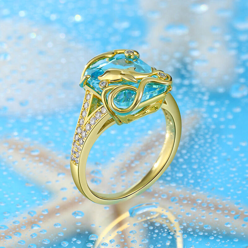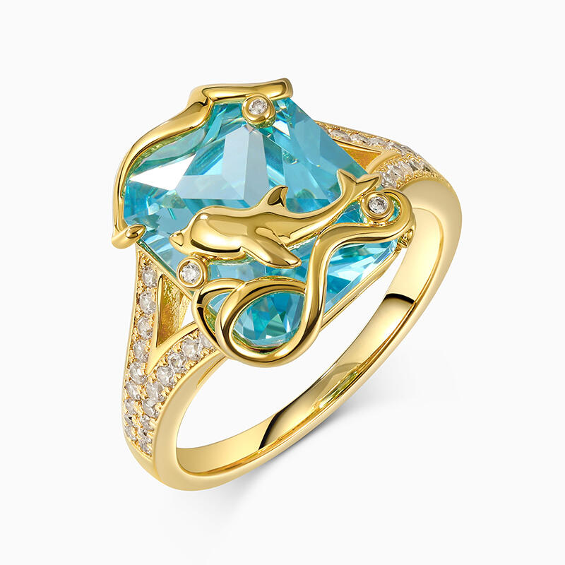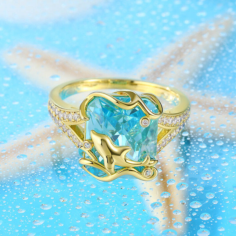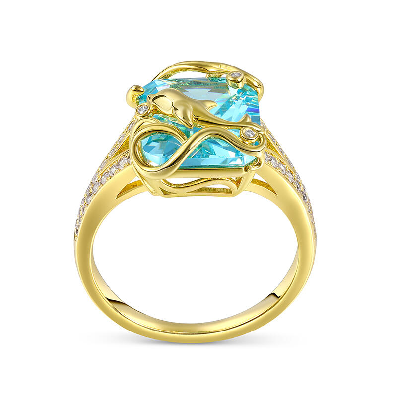Dolphins are considered lucky in many different cultures and a symbol of protection. Crafted in sterling silver, it features a brilliant emerald-cut stone, a yellow-gold tone dolphin and ocean waves. And the shank is brightened by additional small stones, adding extra shimmer to the look of the ring. It looks like a dolphin leaping over the sparkling ocean. If you are a marine lover, then this ring must be your treasure.