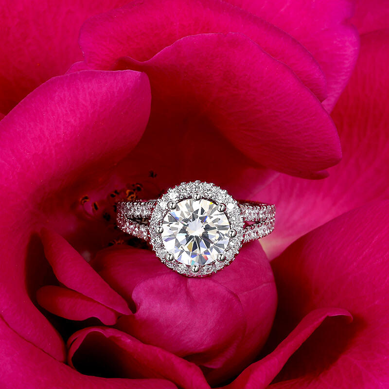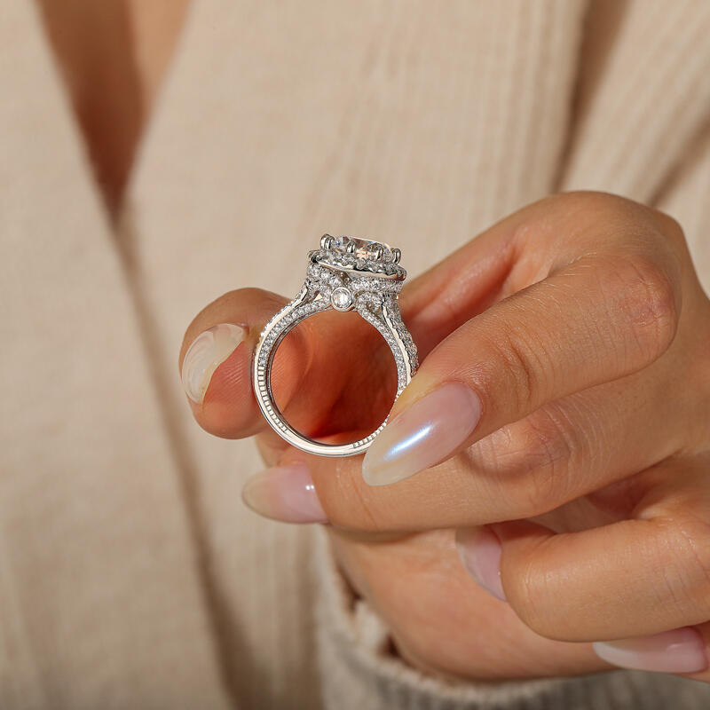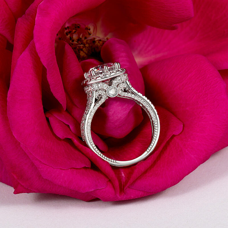 This classic halo engagement ring features a large main stone set in a delicate micro-pave setting, displaying a gorgeous sparkle and nobility. The side of the princess halo ring features a pave X-shaped design, which is as elegant and stunning as a princess's skirt, adding layers and sophistication to the overall look. The overall design is simple yet generous, combining modern fashion sensibility with a classic touch, making it suitable for daily wear and showcasing a woman's noble and elegant temperament.