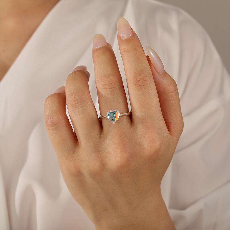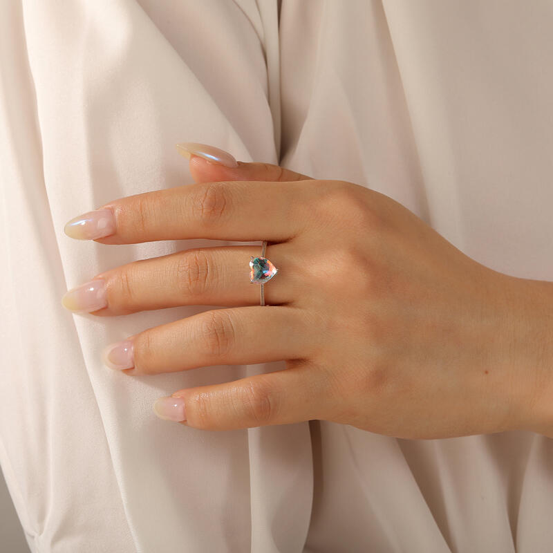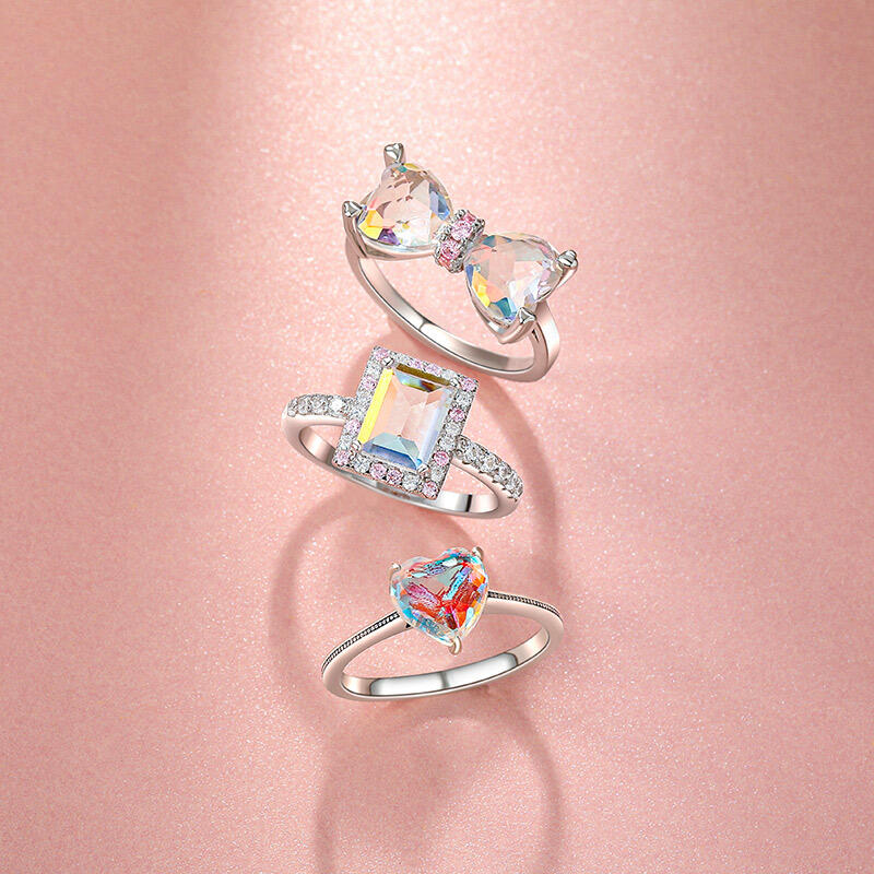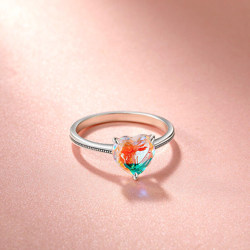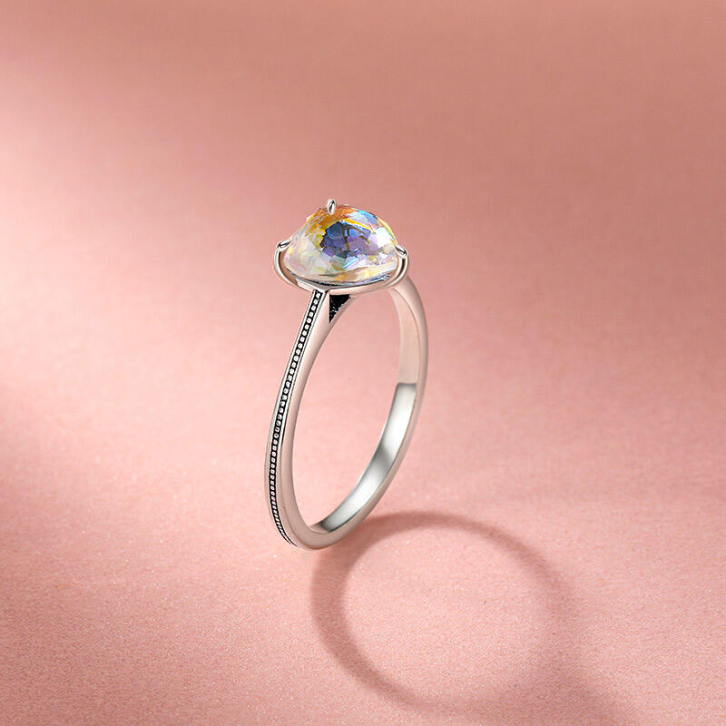 This heart-shaped clear glass promise ring features an exquisite aurora borealis rainbow moonstone as the focal gemstone, renowned for its brilliance and whimsical play of light. The heart shape of the main stone symbolizes romance and true love. The shank of the heart promise ring is elegantly adorned with delicate beaded edges, showcasing meticulous craftsmanship that reflects a sense of sophistication and high-quality artistry. The overall design embodies a captivating allure while exuding warmth and emotion, signifying deep affection and the value of precious love.