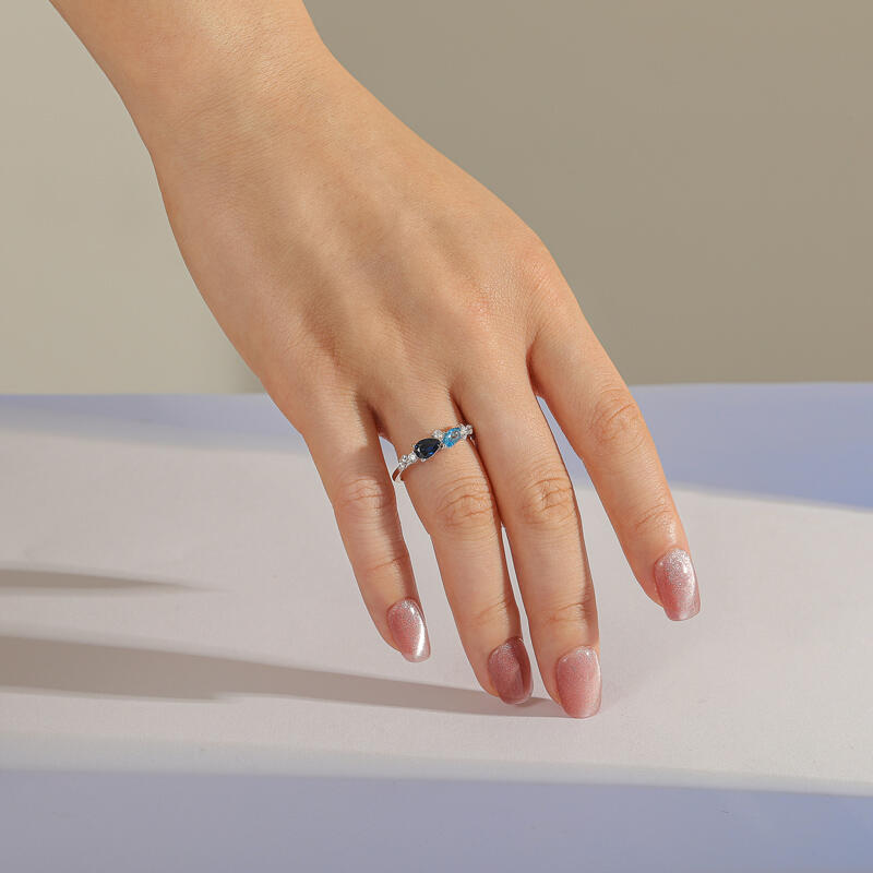 Experience the enchanting allure of the "Spring Magic" cluster ring, a vibrant celebration of the season's beauty. This exquisite sterling silver cluster ring features a captivating arrangement of stones, with a pear-shaped blue stone and a marquise-cut blue stone taking center stage. Surrounding them are smaller round white stones, creating a charming cluster design that mimics the blooming flowers of spring. The slender ring shank adds a touch of delicacy, allowing the cluster to be the focal point while maintaining a graceful and elegant presence on your finger. Crafted with meticulous attention to detail, the "spring magic" cluster ring brings a burst of color and sparkle, making it a perfect accessory to brighten any outfit and capture the essence of springtime romance.