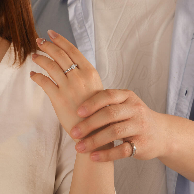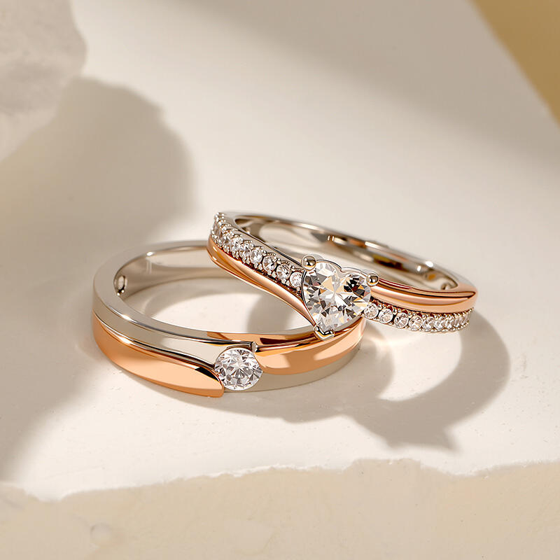 Jeulia Amore curved two tone couple rings by sterling silver beautifully intertwines the essence of love and commitment, making it a perfect symbol for couples. This elegant set features two complementary rings: one adorned with a captivating heart-cut center stone, representing deep connection and affection, while the other showcases a sleek design with a sparkling round-cut stone, symbolizing strength and unity. The unique two-tone design blends warm and cool metals, reflecting a modern aesthetic that honors tradition. The graceful curves of each two tone wedding band not only enhance their beauty but also ensure a comfortable fit for daily wear or special occasions. Together, these couple rings embody a heartfelt promise—a celebration of your shared journey, filled with cherished moments and emotional significance. Celebrate your unique love story with this stunning couple's ring set, a timeless reminder of the bond you cherish.