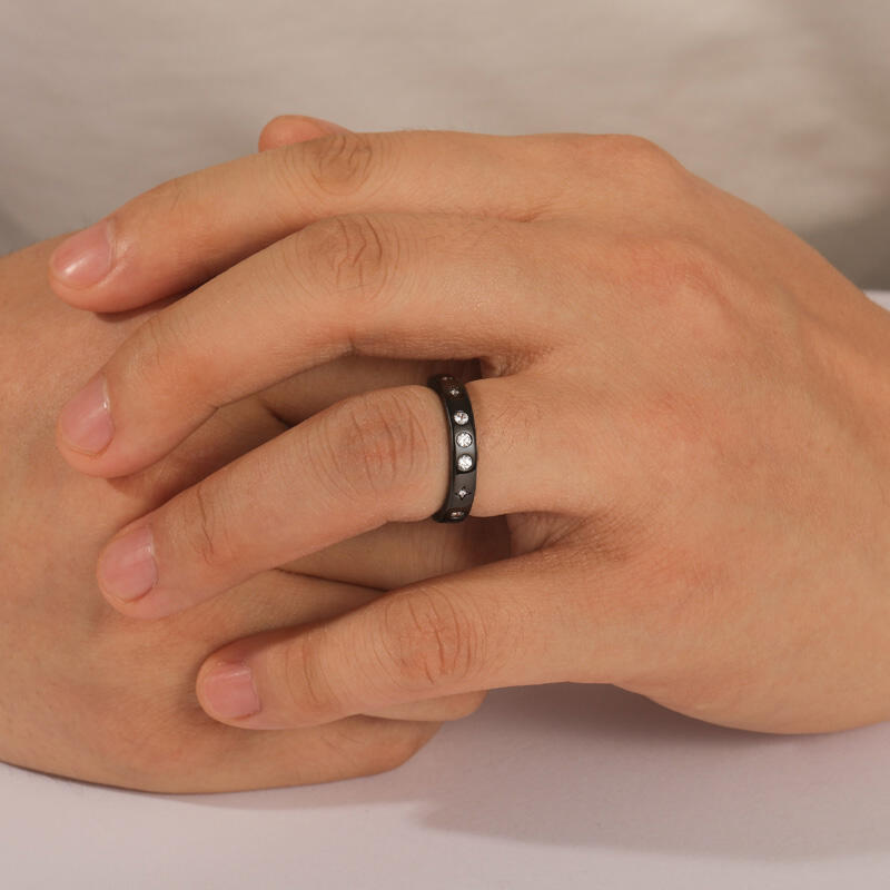 Jeulia black celestial mens ring is a striking piece that combines elegance with a modern edge. Crafted from high-quality sterling silver, this ring for men features a sleek black finish adorned with celestial star motifs and sparkling accents. The design captures the essence of the night sky, making it a unique statement piece for the stylish man. The contrast of the black band with the shimmering stones adds depth and sophistication, perfect for both everyday wear and special occasions. Celebrate your individuality with the Jeulia black celestial men's ring—a symbol of your journey and aspirations. This men's ring is not just an accessory; it’s a bold expression of style and character, destined to be cherished for years to come.
