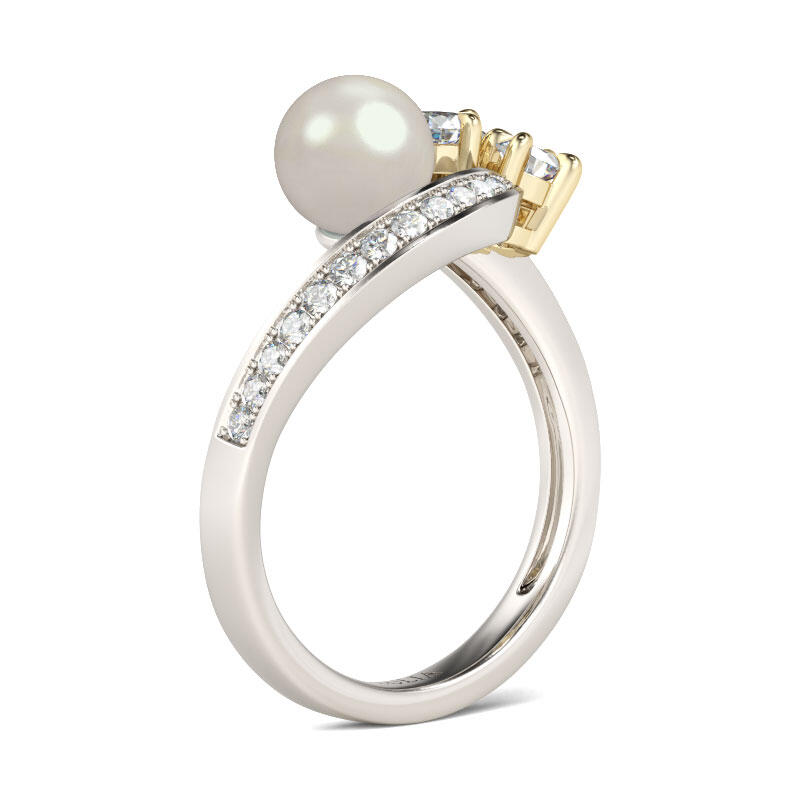 Dainty and delicate, this lovely ring makes an adorable gift for loved one or yourself. Crafted in two tone sterling silver, set with a pearl and glistening white stones, the asymmetric bypass ring will show a unique and elegant look on your finger. Treat yourself or loved one with this piece.