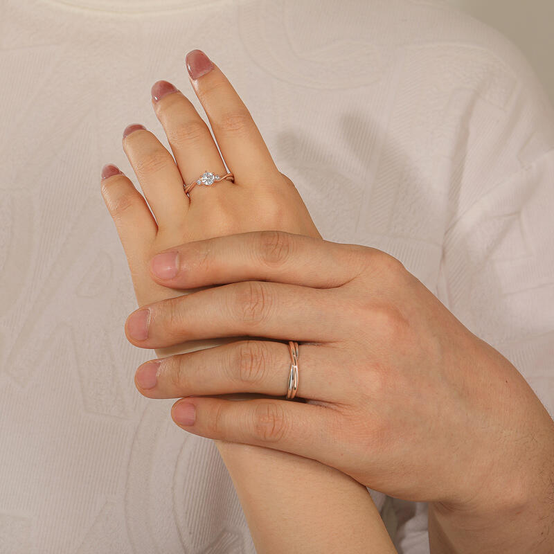 Jeulia classic custom two tone couple rings with twist band, her three stone twist ring anchors a birthstone within silver-rose helices; his wedding band mirrors the duality in minimalist braids. When aligned, their twists sync like magnetic poles—her zircon accents echo silver’s clarity, his rose gold strands warm the composition. Separate, each piece holds its own language: hers a helix of chosen lineage, his a manifesto of muted contrast. No boxes, no gimmicks—just two wedding ring bands that redefine unity as a choice renewed daily, their dialogue written in light and metal, never locked, always fluid.
