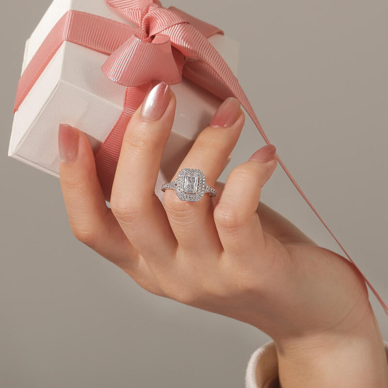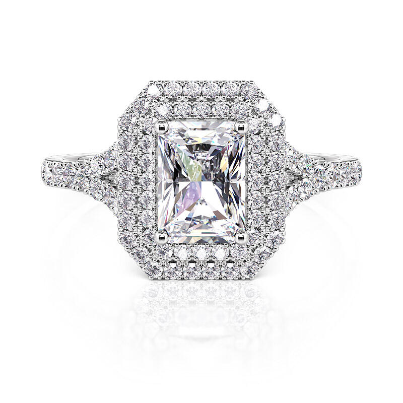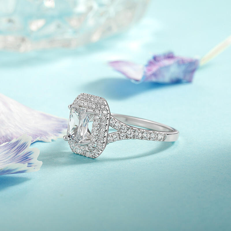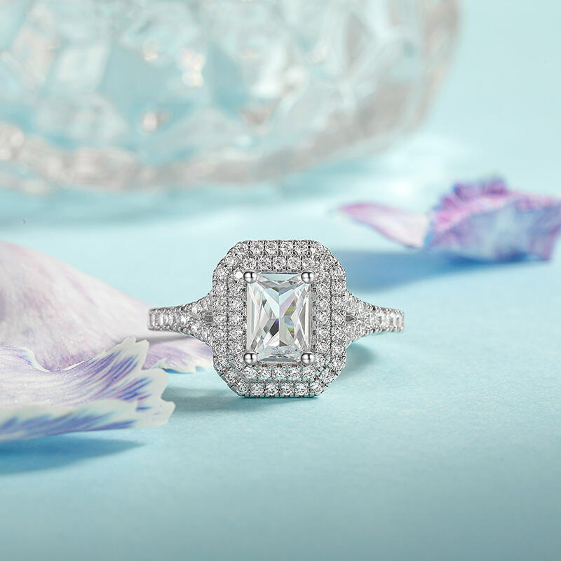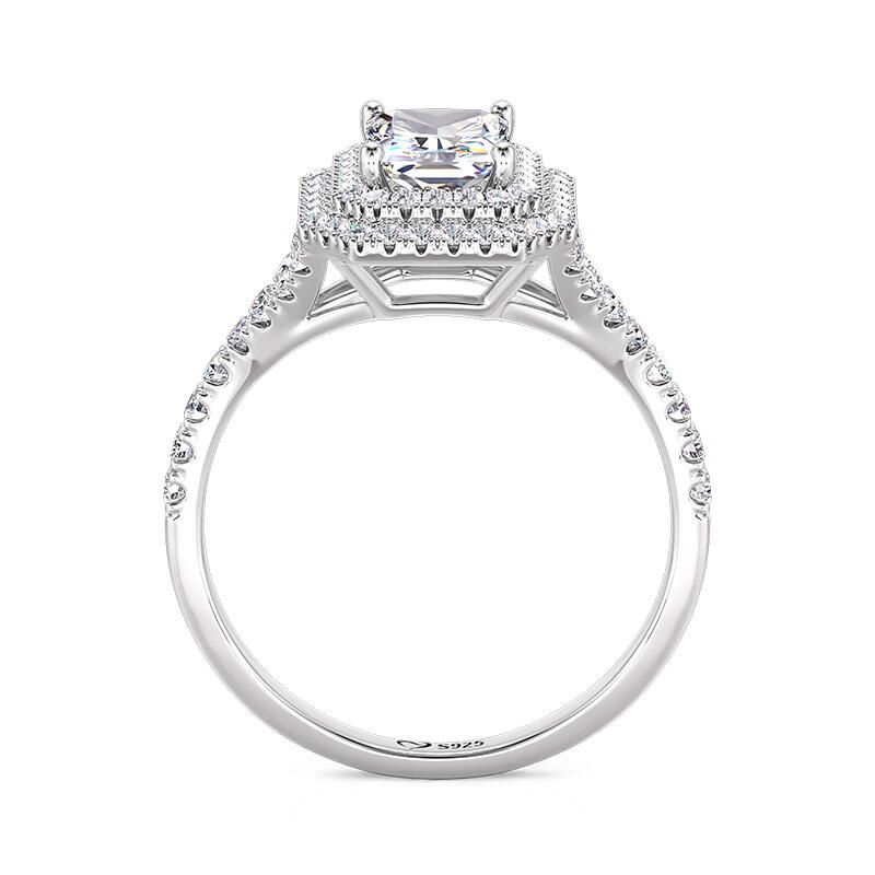 Gorgeous and sophisticated, this classic double halo engagement ring highlights the elegance and luxury of modern jewelry design. Set in the center is a radiant cut stone, whose unique cut allows the stone to show amazing fire and brilliance in the light, as if hiding an endless starry sky. Surrounded by a double halo design, the finely micro-set round stones are layered to create a radiant halo effect, subtly accentuating the splendor and brilliance of the center stone. The arms of the classic radiant-cut ring are equally delicate, with sparkling round stones set in pavé to enhance the overall visual impact of the ring, while the streamlined design of the arms ensures a comfortable fit and adds elegance to the sterling silver engagement ring at the fingertips.
