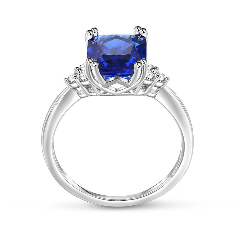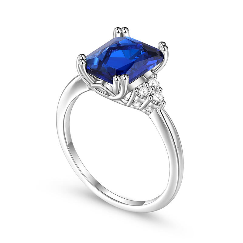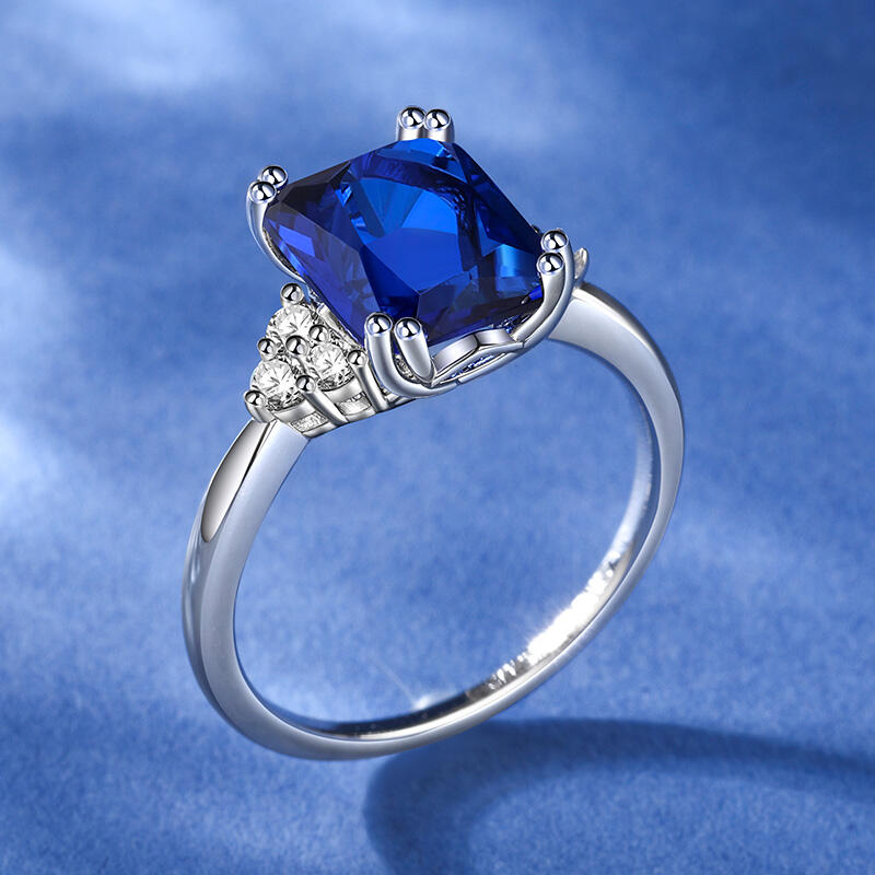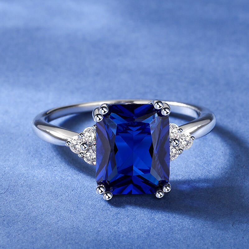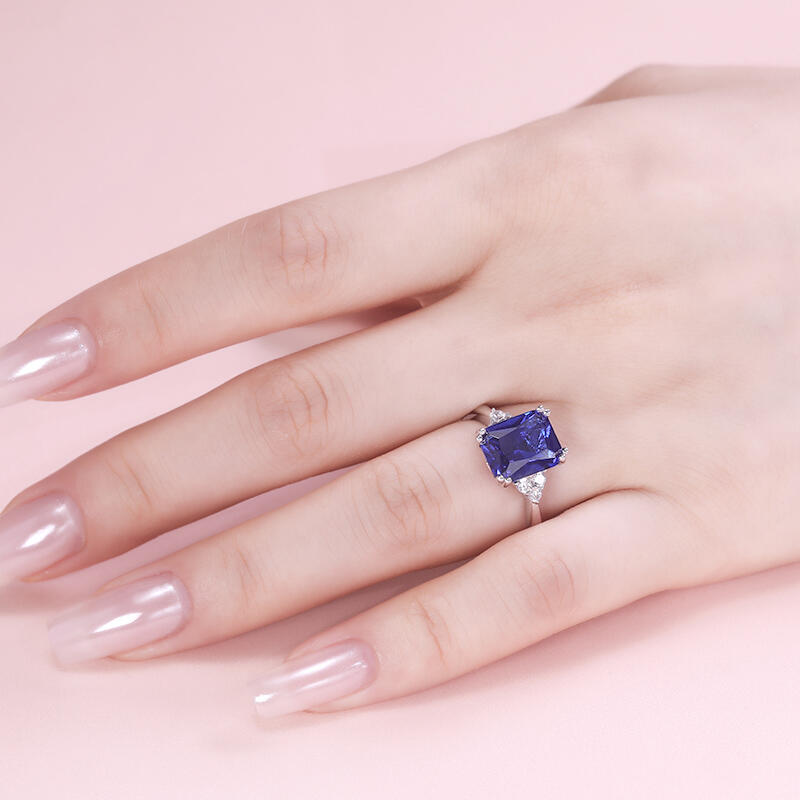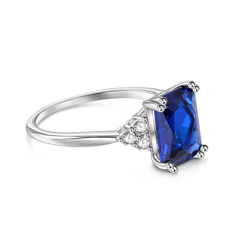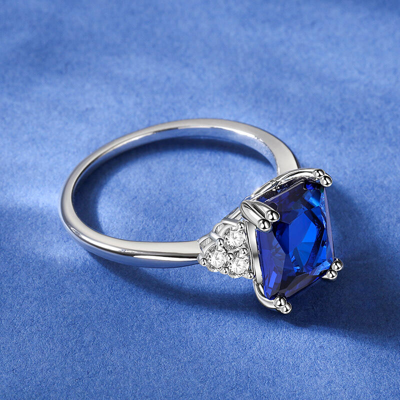 This beautifully crafted engagement ring will thrill whoever receives it! With a Deep blue center stone and gorgeous white stones on either side set in polished sterling silver, it is both modern and classic! Sleek and stylish, this ring will add flair to any outfit without being overly elegant, and can be easily paired with formal wear. This ring is the perfect gift for yourself or a loved one!