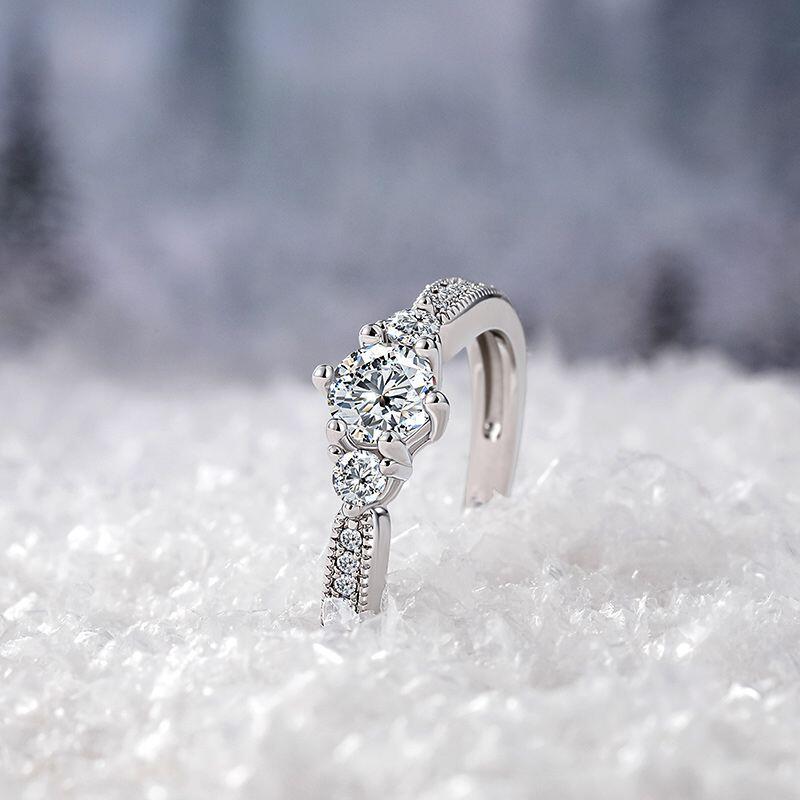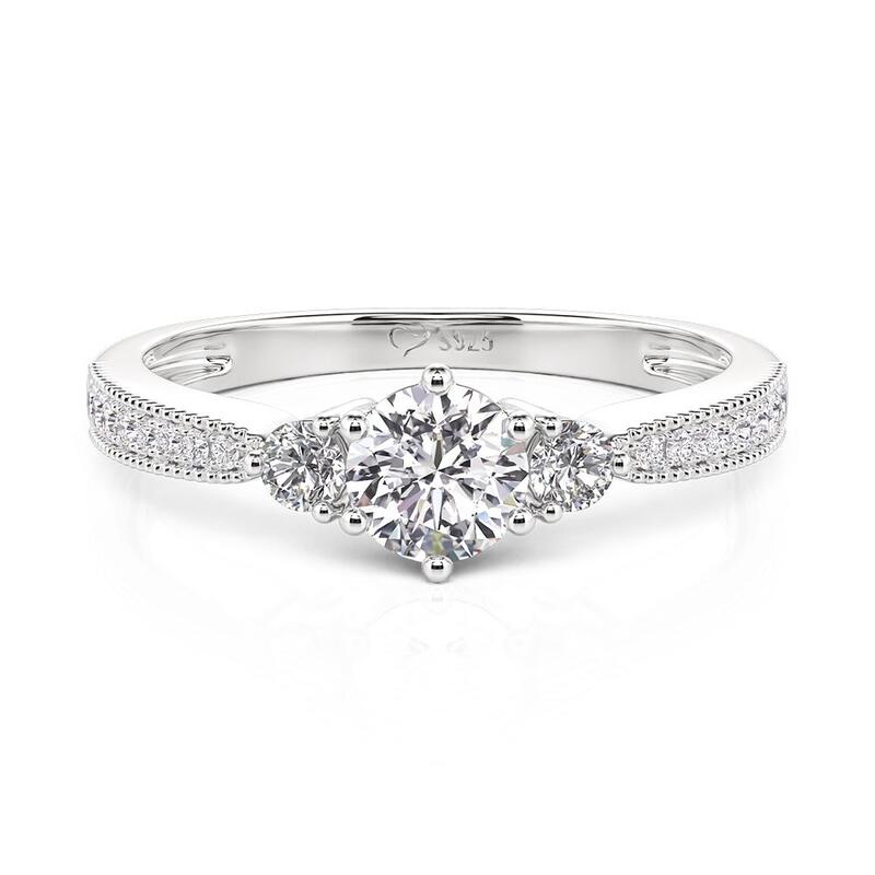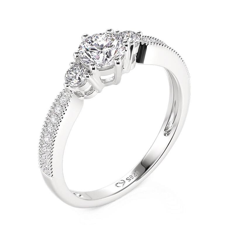 Three gems ascend along a band that gently tapers away from the stone, its slender lines paved with a continuous trail of sparkle. The central stone holds court while the tapering silhouette elongates the finger. This Jeulia Three-Stone Reverse Tapered Engagement Ring is a design where classic form meets refined modernity, for a love that grows more graceful with time.
