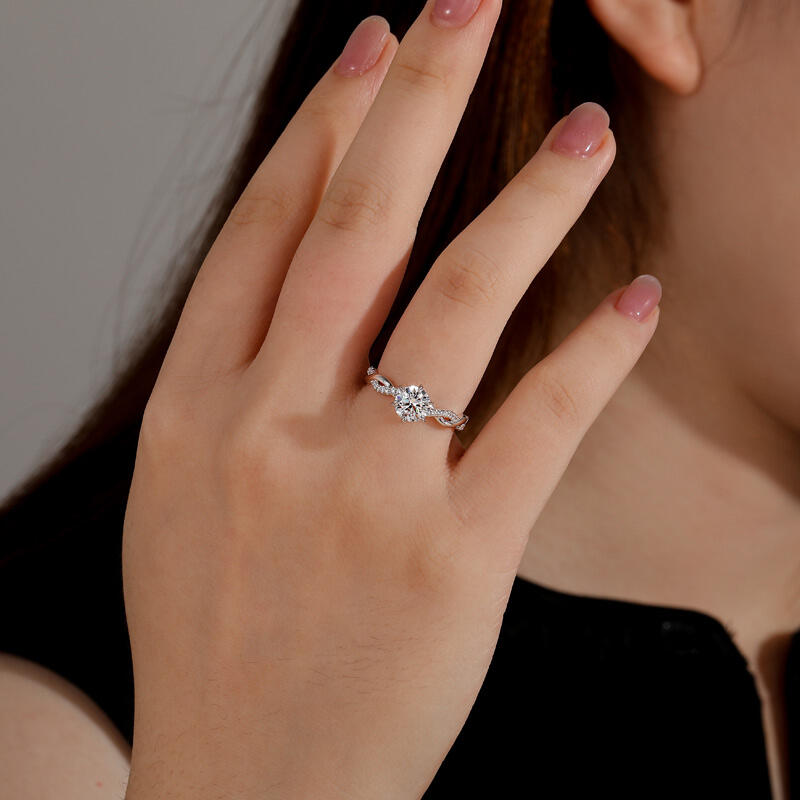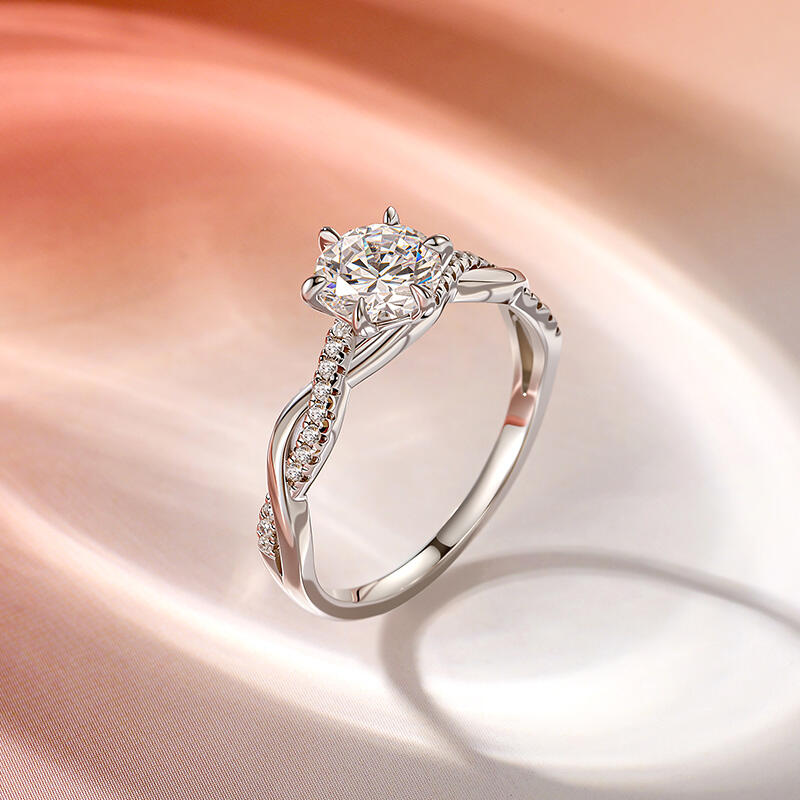This Jeulia classic round engagement ring seamlessly blends timeless elegance with modern design elements. The central round center stone is set using the timeless six-prong setting technique, with six meticulously crafted prongs securely holding the stone like stars, maximizing the brilliant fire and sparkle of the round brilliant cut. The ring shank features the iconic Twist design, with two strands of silver wire elegantly intertwined to create a flowing three-dimensional texture, symbolizing the intertwining of lovers' lives while visually extending the lines of the finger.