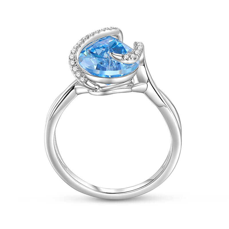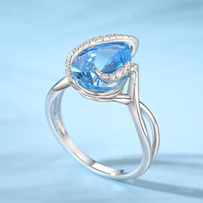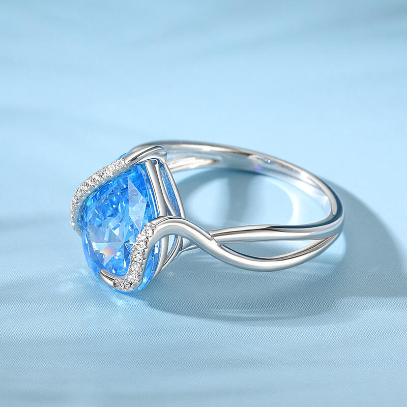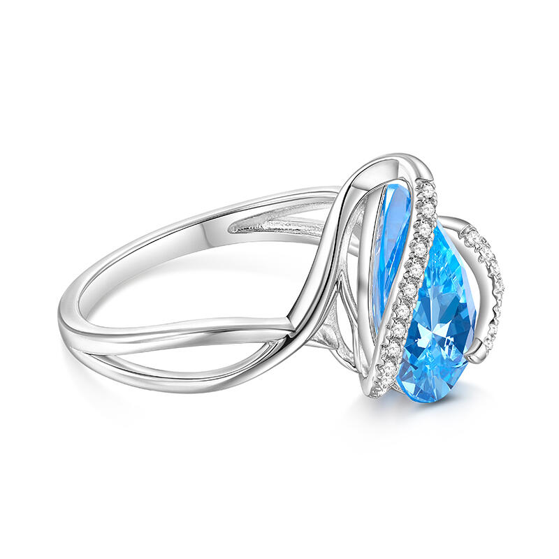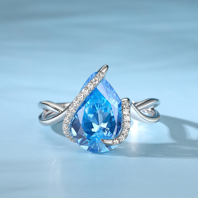 Highlighted by an aquamarine blue pear-cut main stone, this sterling silver ring exudes a captivating oceanic flavor. The designer has skillfully incorporated twist elements to make the whole ring more vibrant and stylish. Wear this blue pear engagement ring as if you are in a serene underwater world, showing your inner freedom and spirituality.
