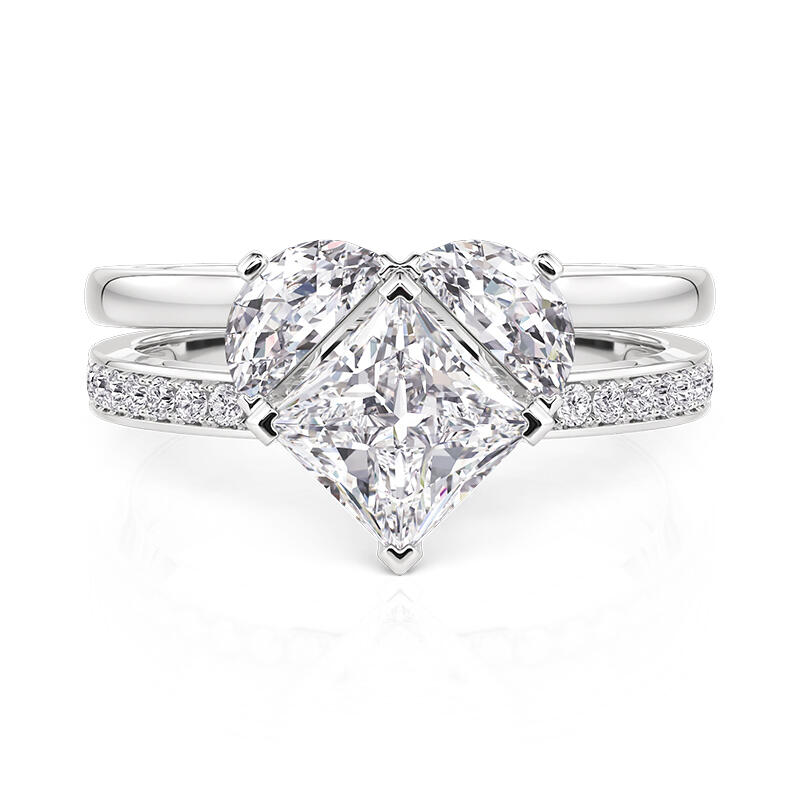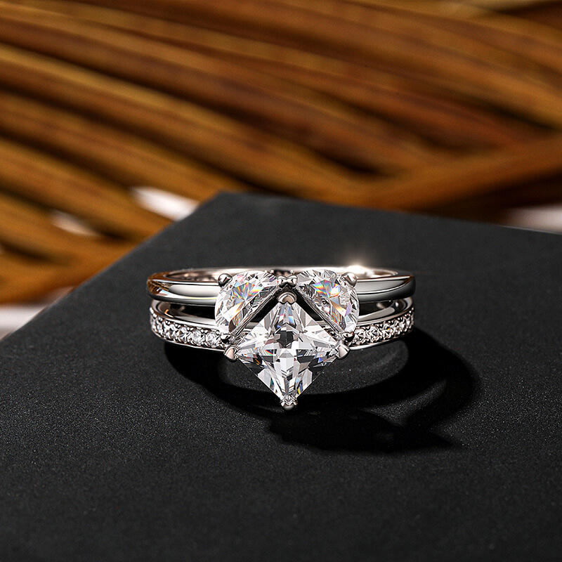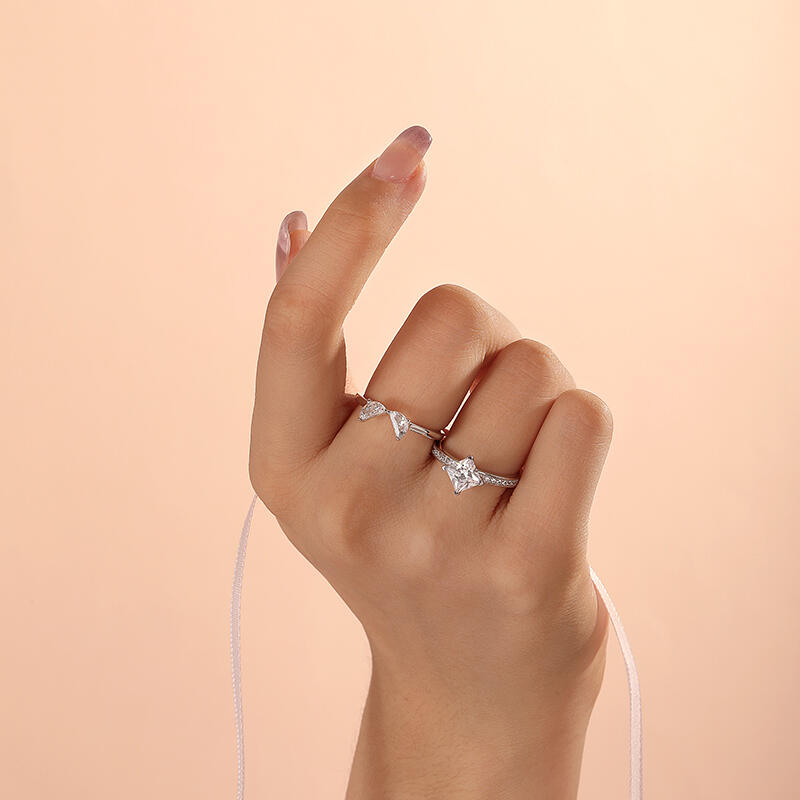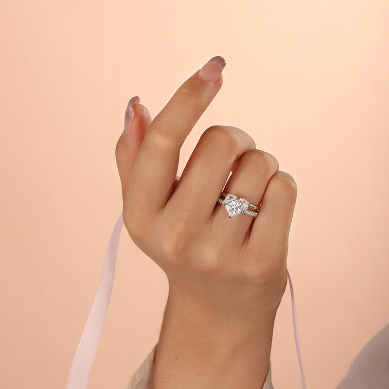 The Jeulia Split Heart Ring Set features two crescent gems on one ring that frame the square-cut solitaire on its counterpart, their complementary shapes locking into a single heart outline. Pavé zircons trace the curves like dewdrops on a spiderweb, amplifying the sparkle without overshadowing the symbolic form. A structural romance—modular, poetic, and brilliantly transparent.