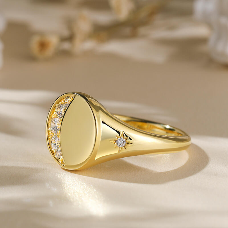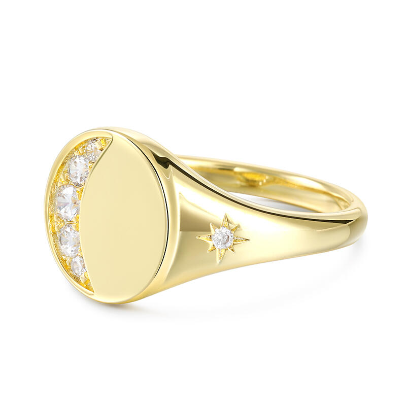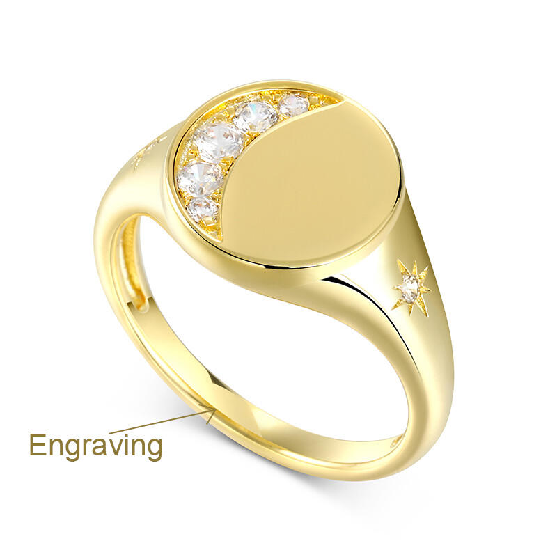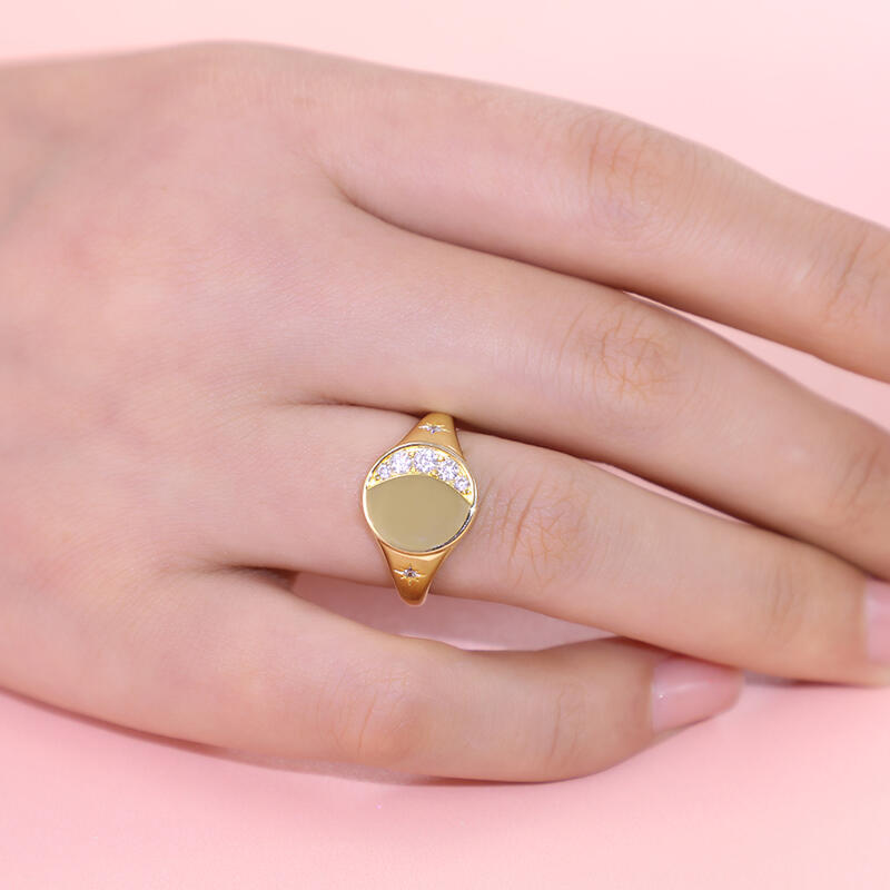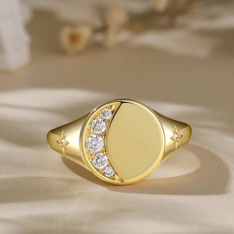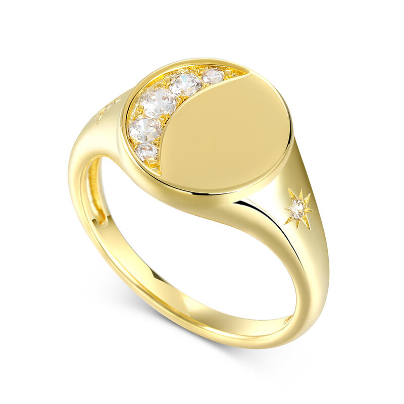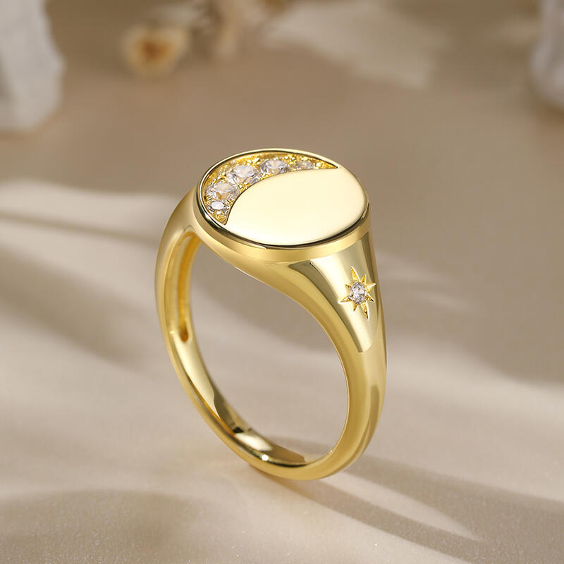 This yellow gold tone signet ring has an moon and star encrusted for extra sparkle. Five round brilliant white stones are set in sterling silver to form a perfect Crescent Moon. Just the right amount of glimmer. An out of this world design with lots of sparkling personality.