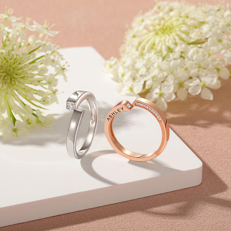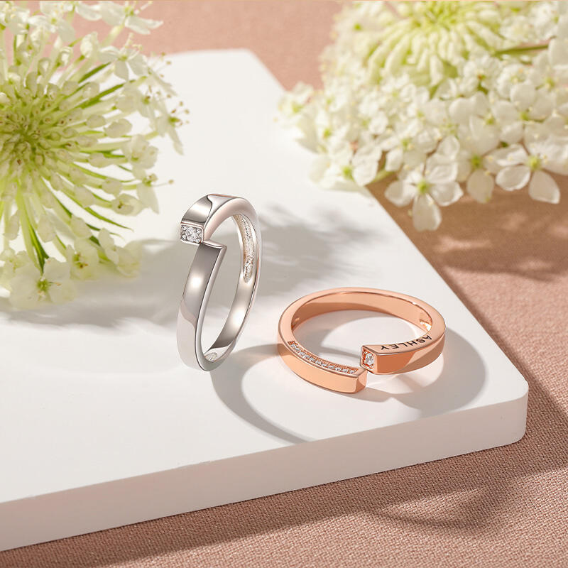 Celebrate your unique bond with our custom name couple rings with side bypass sterling silver. The female ring features a stunning rose gold plating, adding a touch of warmth and femininity to its design. The male ring, on the other hand, maintains a classic silver finish, exuding a sense of sophistication and strength. Together, the two couple rings complement each other perfectly, symbolizing the harmony and balance in your relationship. The bypass design is both stylish and symbolic, representing the intertwined paths of your lives. The side of each couple ring can be custom-engraved with names, initials, or a special date, making them truly unique to you and your partner. Embrace the beauty of simplicity and personalization, and let custom name couple rings become a lasting symbol of your love.