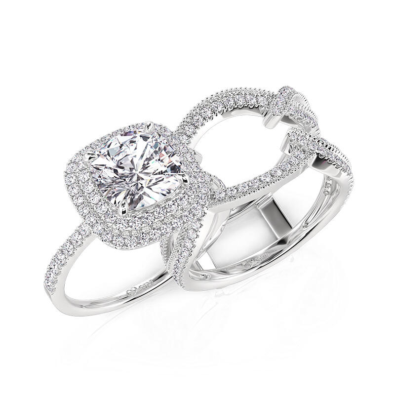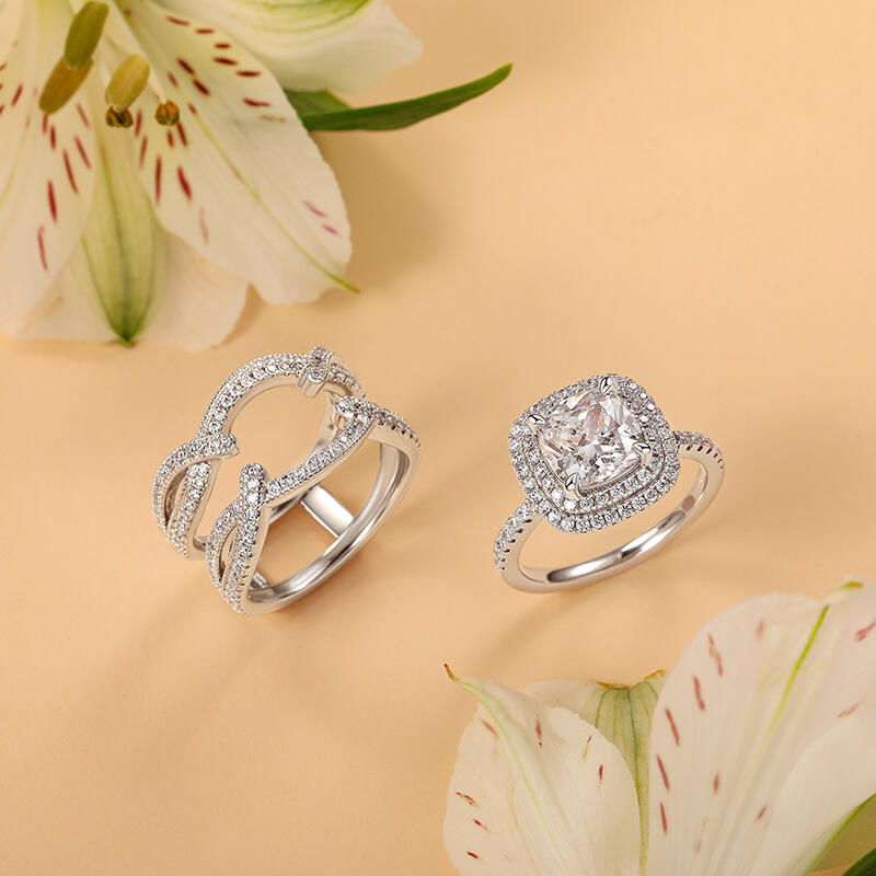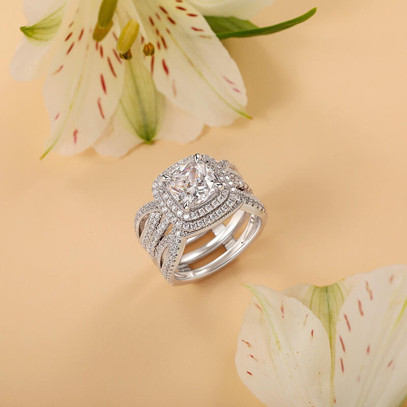 This nesting wedding ring set layers dual halos into a symphony of light—inner ring’s pavé gems ripple outward like moonlit waves, while the outer ring fans open for galas, transforming subtlety into celestial grandeur. Engrave coordinates along the inner curve, a whispered reminder that love’s brilliance deepens when layers align, whether clasped close for anniversaries or parted to let each halo wedding ring its own aria of radiance.