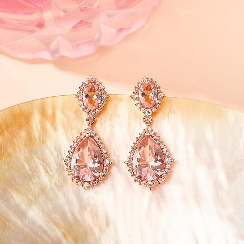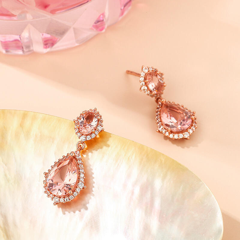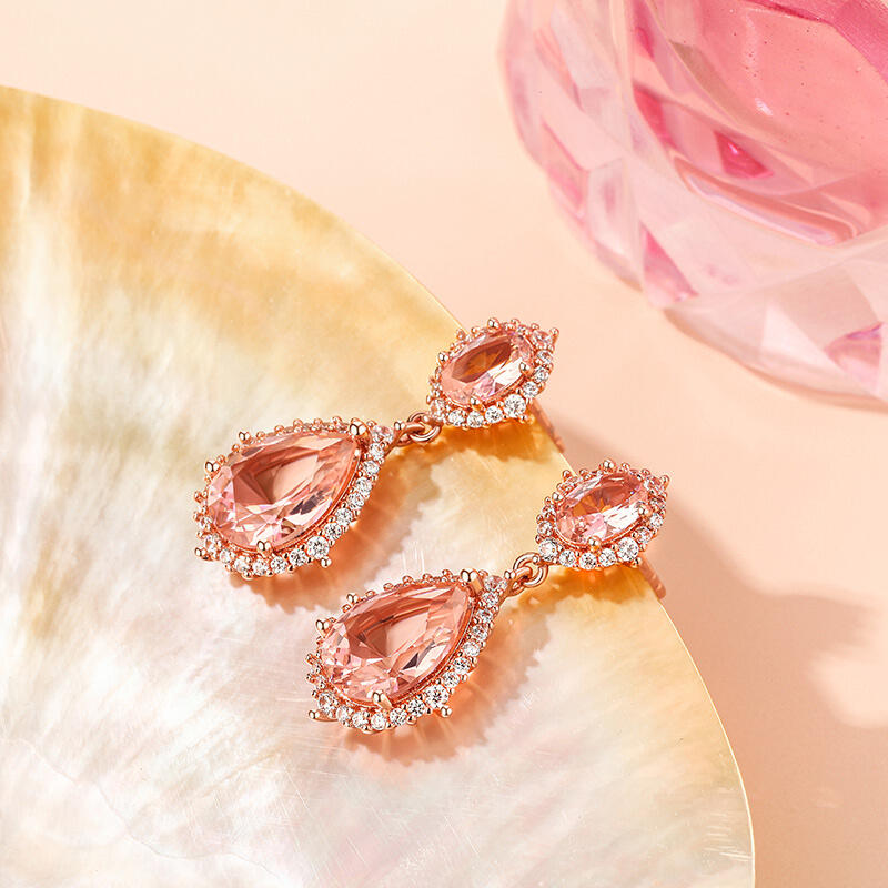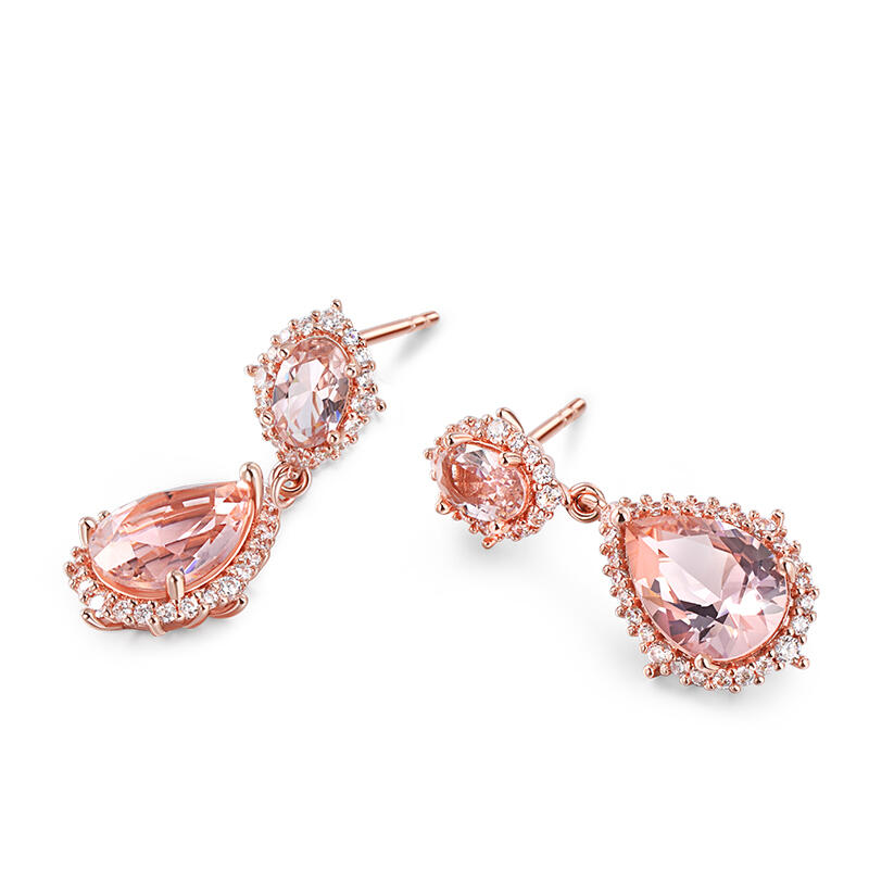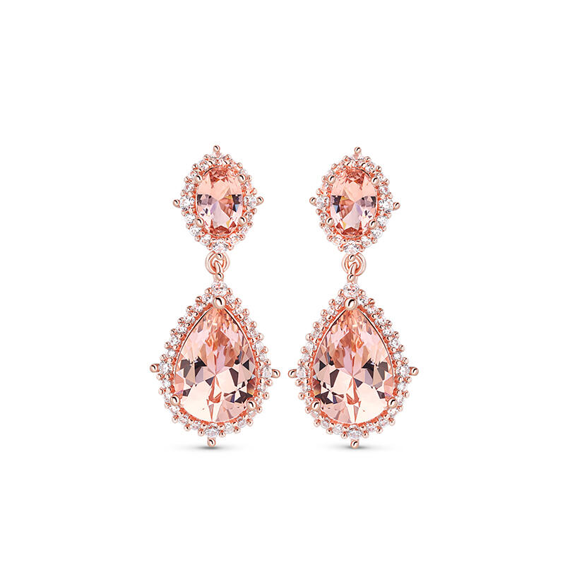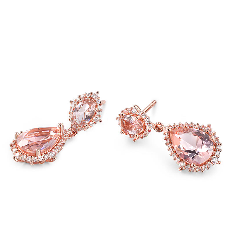 Shimmering with vibrant autumnal tones our statement fancy pink earrings are perfect for the ultimate special occasion. A pair of morganite earring featuring two elegant pear cut stones take centre stage, surrounding the centre stone is a halo of brilliant round cut stones, at the top of the morganite is located another pear shaped morganite with the two point meet each other. Both these stones have been suspended from delicate rings that ensure that they will move delicately with the wearer.