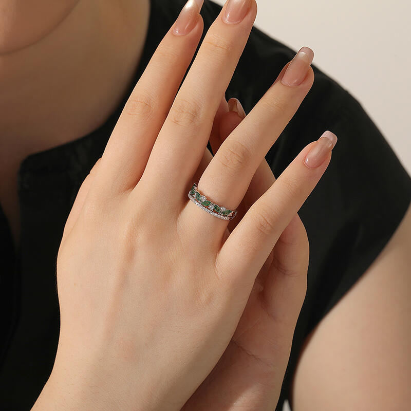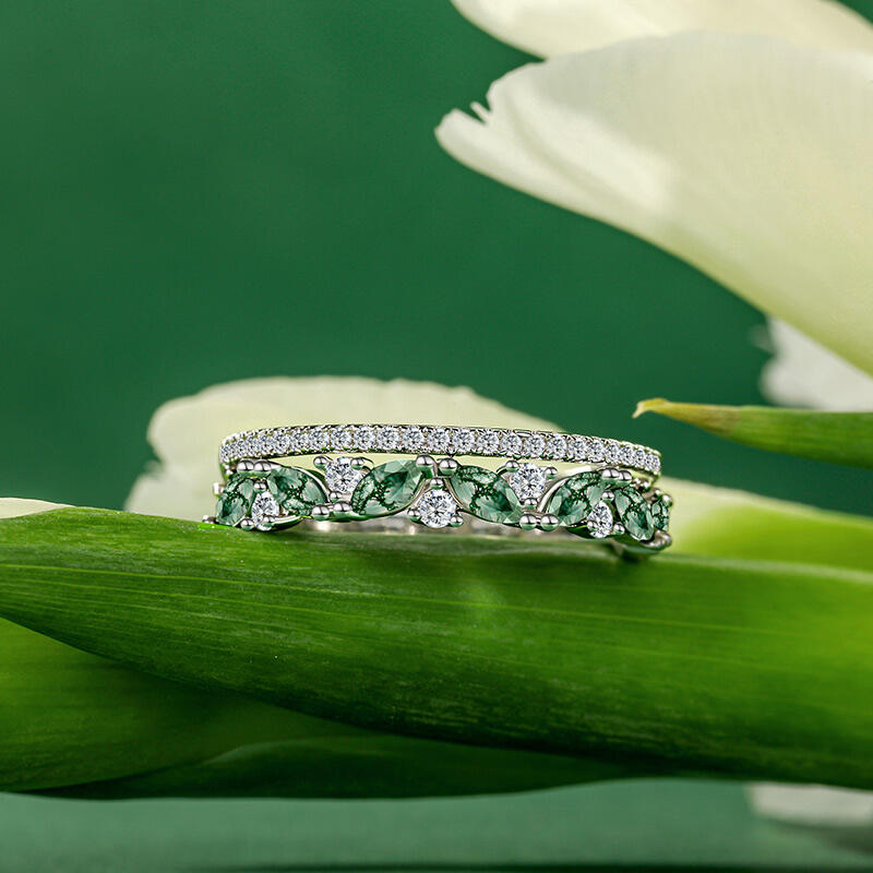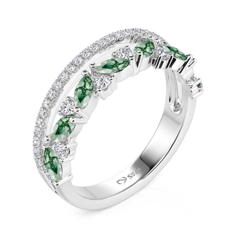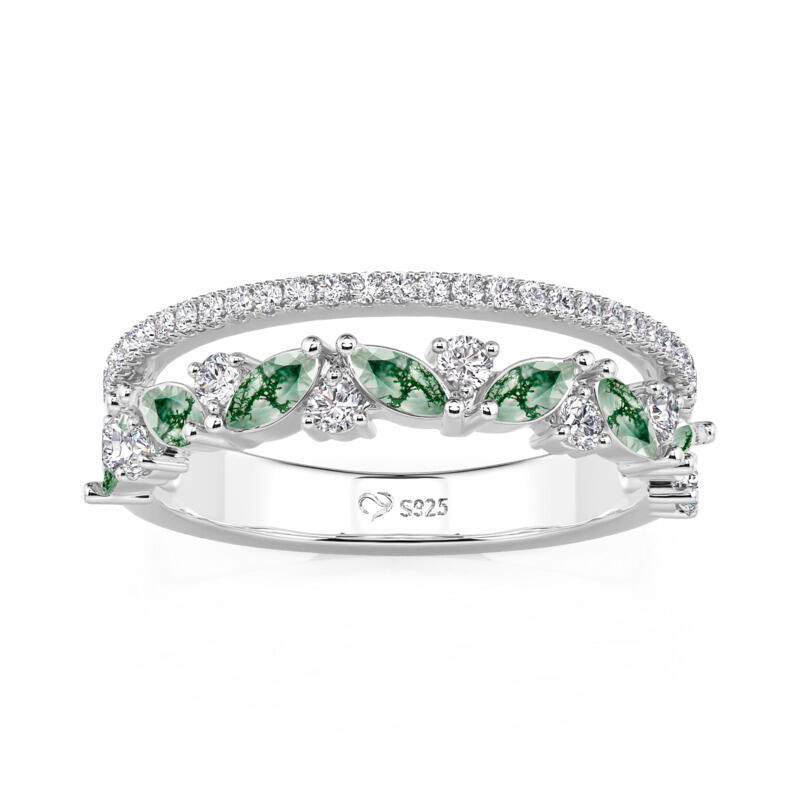 This Jeulia double-row moss agate ring for women is crafted from 925 sterling silver. The upper row features densely set sparkling round stones, exuding elegance and luxury. The lower row cleverly alternates between marquise-cut moss agate and round stones. Each agate's unique moss-like texture contrasts beautifully with the fiery brilliance of the pure white stones, creating a harmonious blend of natural beauty and opulence. The double-row design employs a clever width difference to create a three-dimensional layered effect, maintaining an overall lightweight feel while emphasizing material contrast. The marquise-cut stones extend visual lines, while round stones add a touch of liveliness. No maintenance guide is needed to keep its captivating luster, making this cluster ring a unique yet elegant choice for everyday wear.