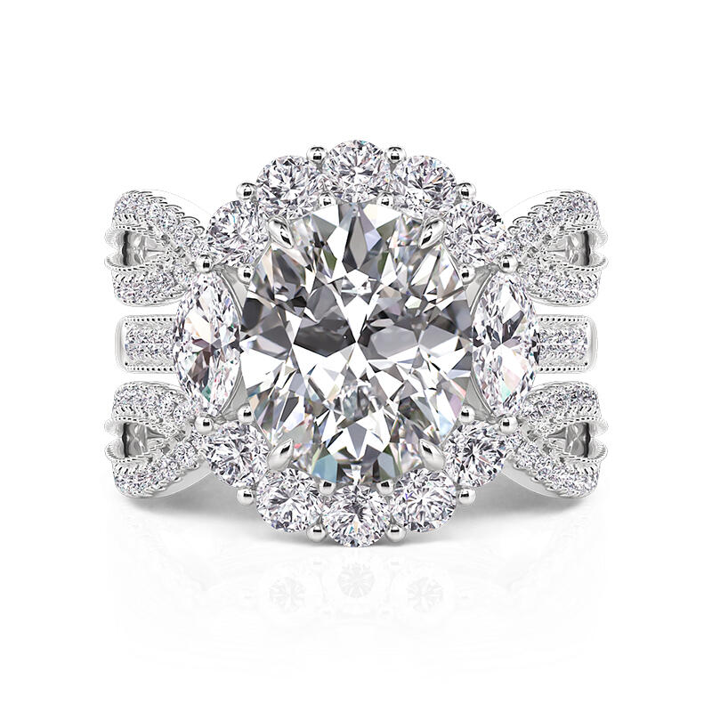Jeulia elegant sparkling halo oval engagement ring set 2PC, An oval gem floats within a double halo, its facets cut to throw light in wide, liquid arcs. The enhancer halo engagement ring band wraps beneath like a comet’s tail, micro-pave stones trailing into a vanishing point. Wear them fused for opera-night grandeur, or separate the halo to let the solitaire echo lone moonlight on still water. This oval engagement ring set doesn’t shout; it conducts light’s orchestra, proving opulence thrives in restraint.