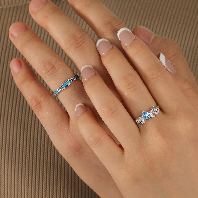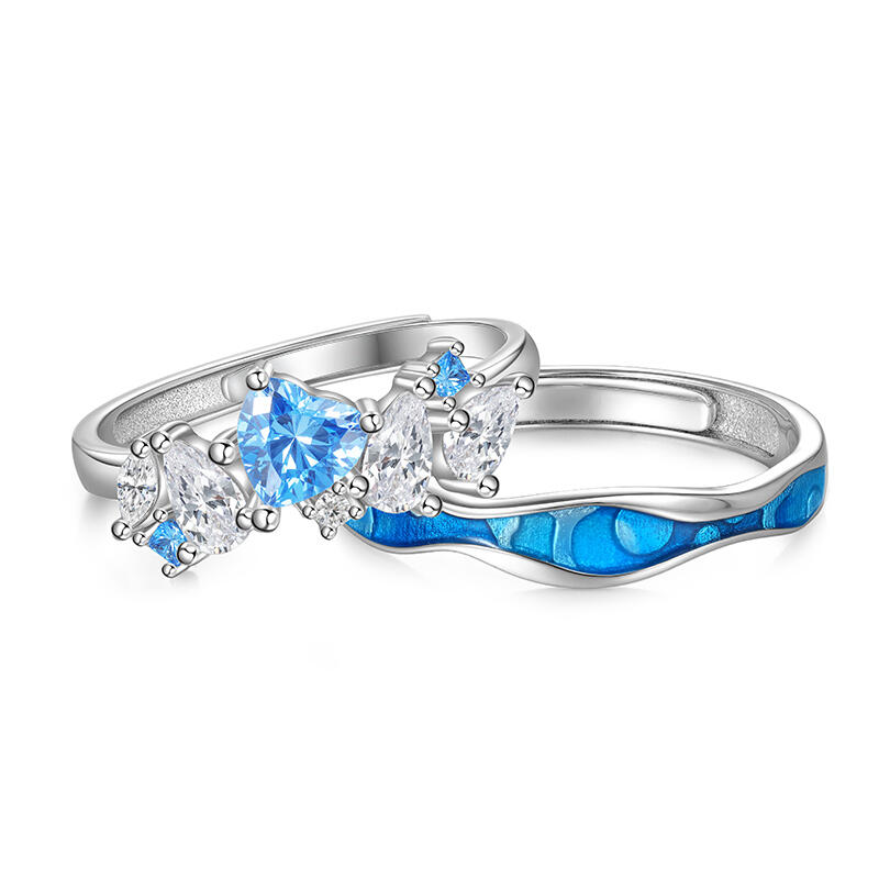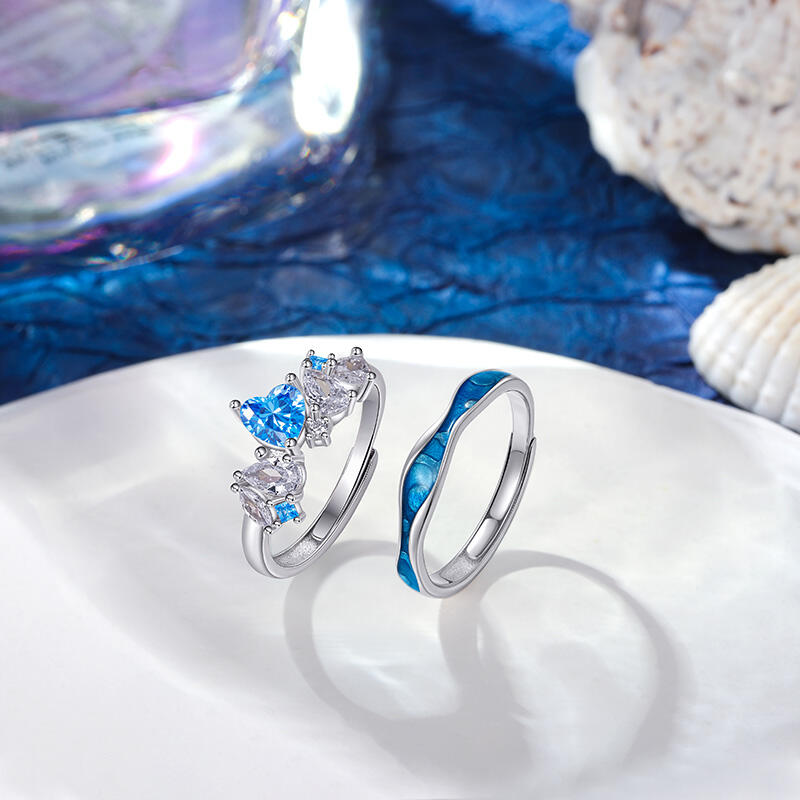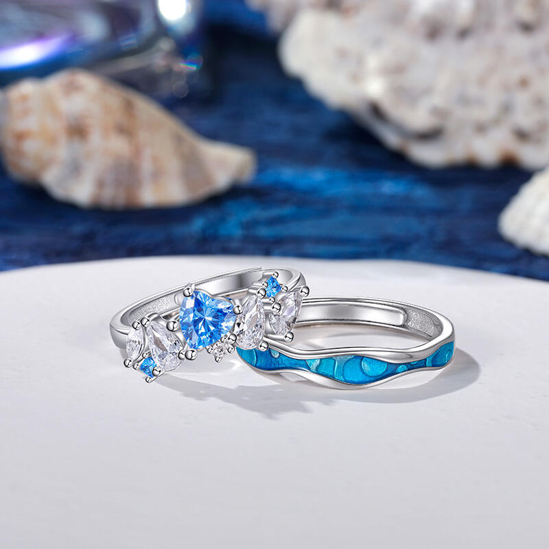 This tidal duo sea couple ring set — her band blooms with clustered sapphires and diamonds, their icy fire mirroring bio-luminescent tides, while his matte ceramic arc echoes the abyss where light bends but never breaks. The waves etched into her platinum wedding band crest toward his deep-sea grooves—two currents designed to interlock when hands touch, mapping a private latitude where her shimmer feeds his stillness. Inside her curve: coordinates of your first midnight beach walk. Inside his depth: the moon phase that pulled you under. No matching motifs, just complementary physics—a love that thrives where her surface ripples meet his unyielding pressure. For those who know oceans aren’t conquered, but danced with… in tides, in time, in two tones that rewrite the meaning of "anchor."