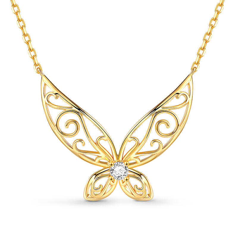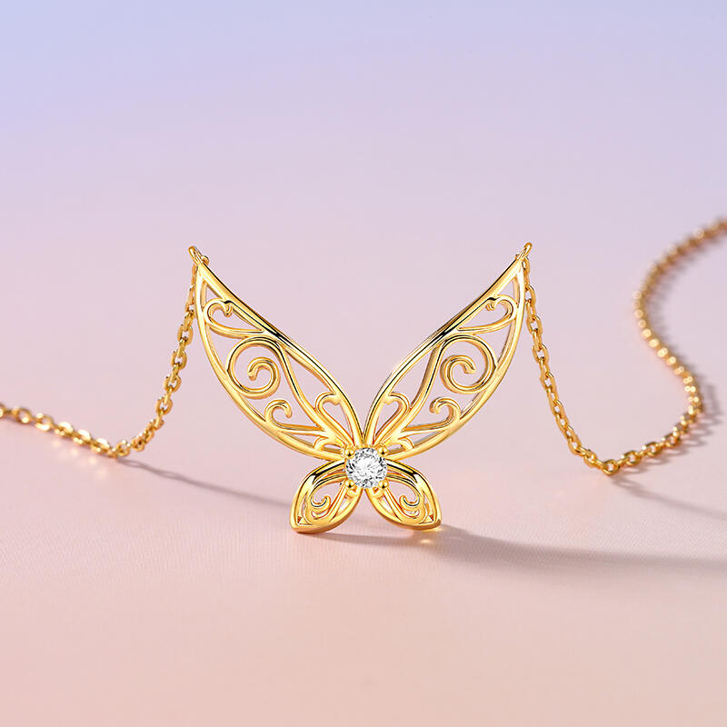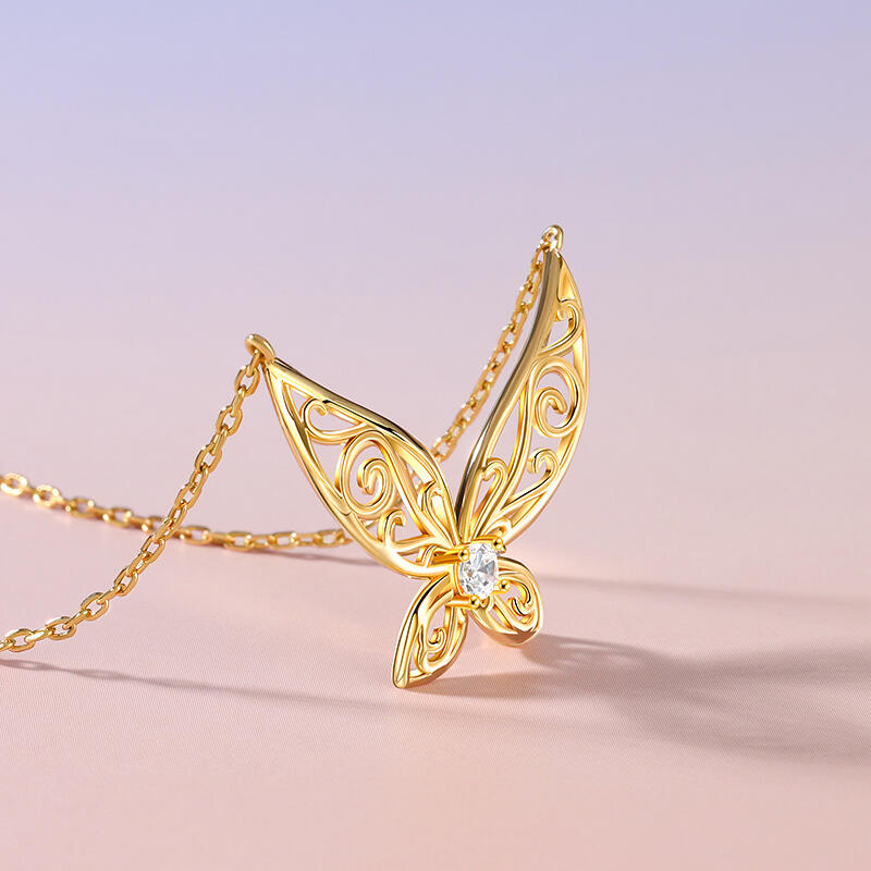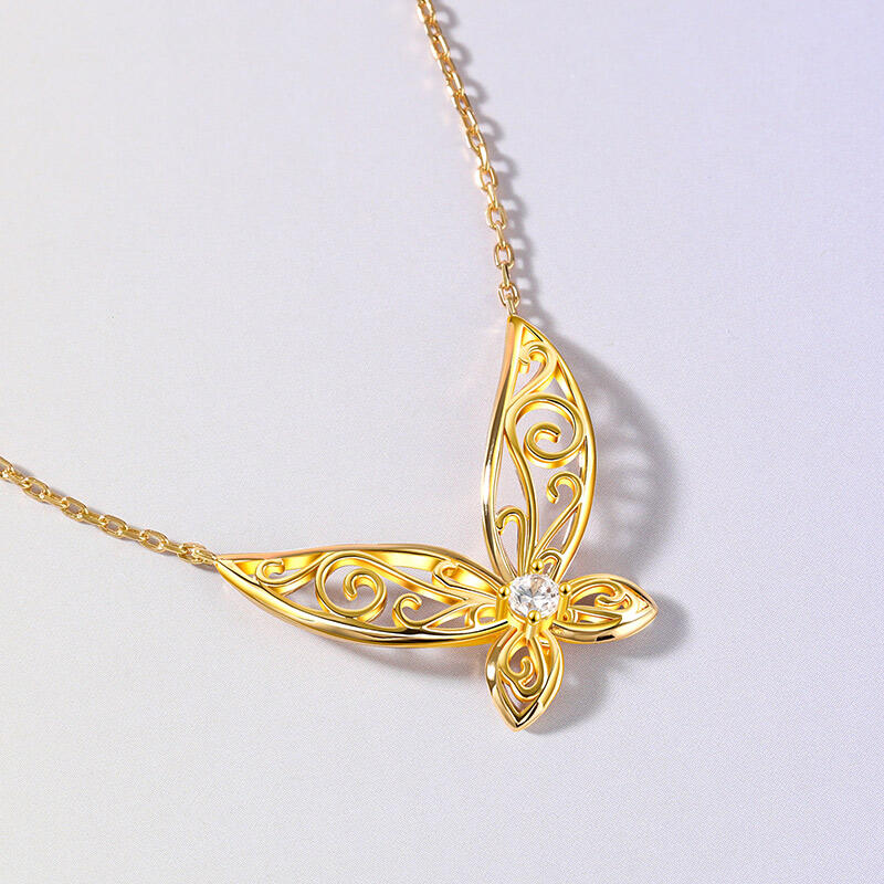 This enchanting golden sterling silver necklace, inspired by the ethereal grace of elf wings. The pendant mesmerizes with intricate hollow patterns, evoking a sense of intelligence and vivacity. At its heart lies a round stone, radiating purity and light. It's a tribute to the beauty of fantasy and the elegance of nature. Wear it as a symbol of your own inner magic, and let it captivate all who behold its charm.
