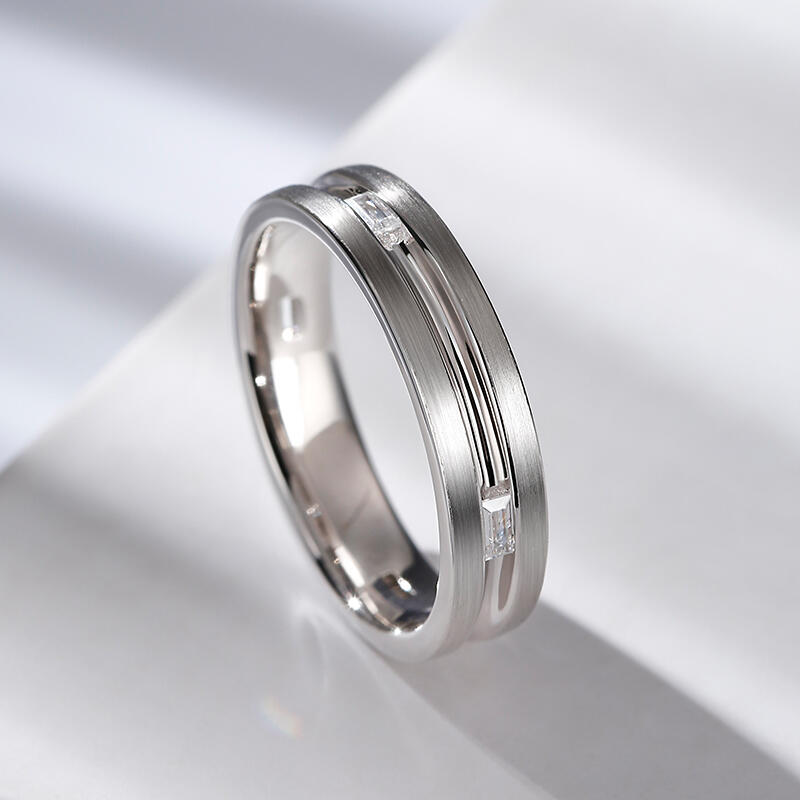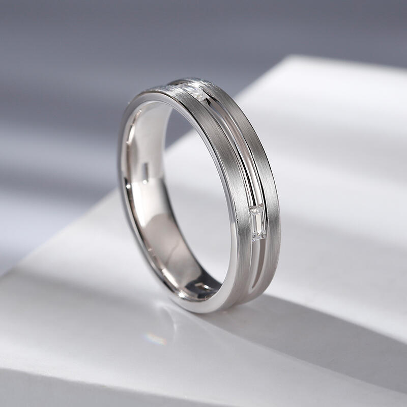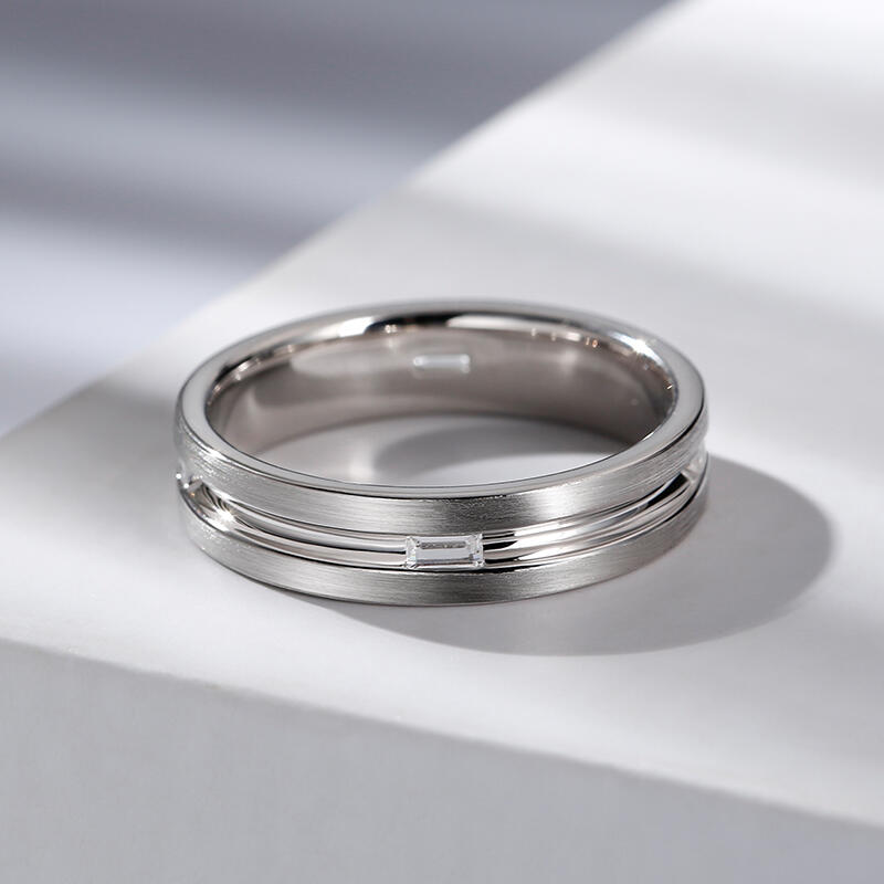 He'll appreciate the distinctive look of this fashion-forward wedding band. This unique ring features a high polish groove inlaid within a contemporary matte band. The alluring emerald-cut stones add an eye-catching flair. A streamlined style just for him, this wedding band is a modern expression of your affection.