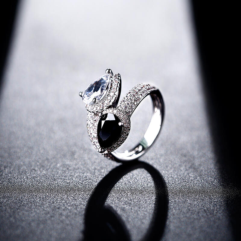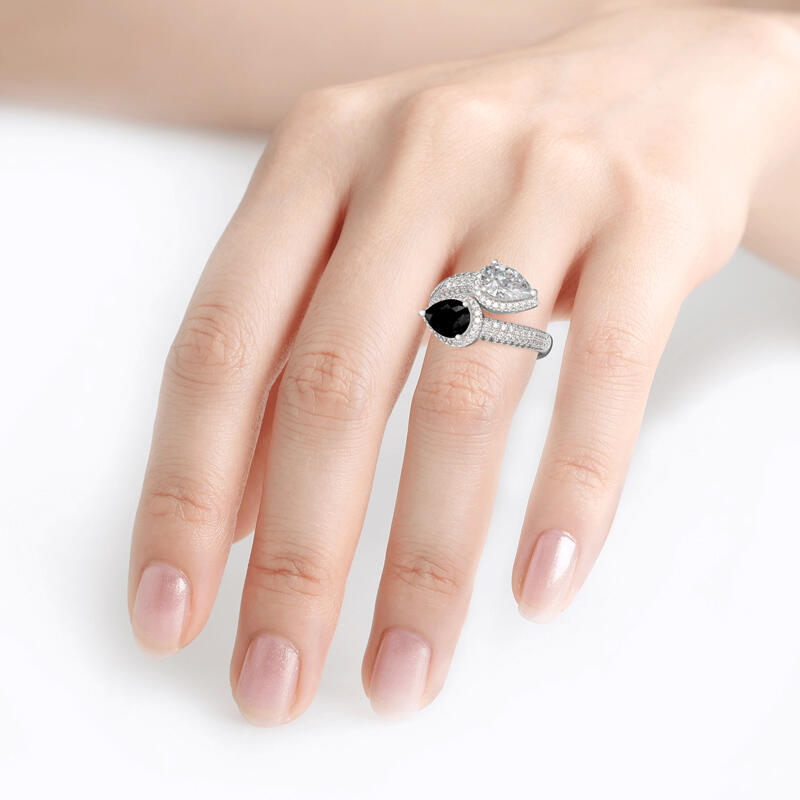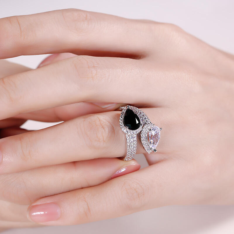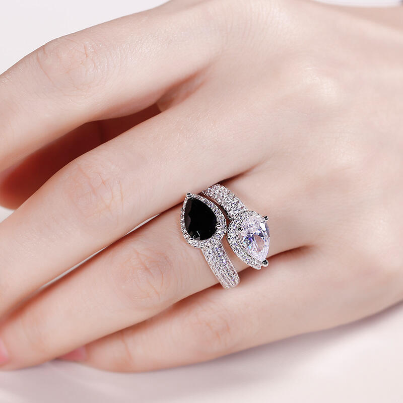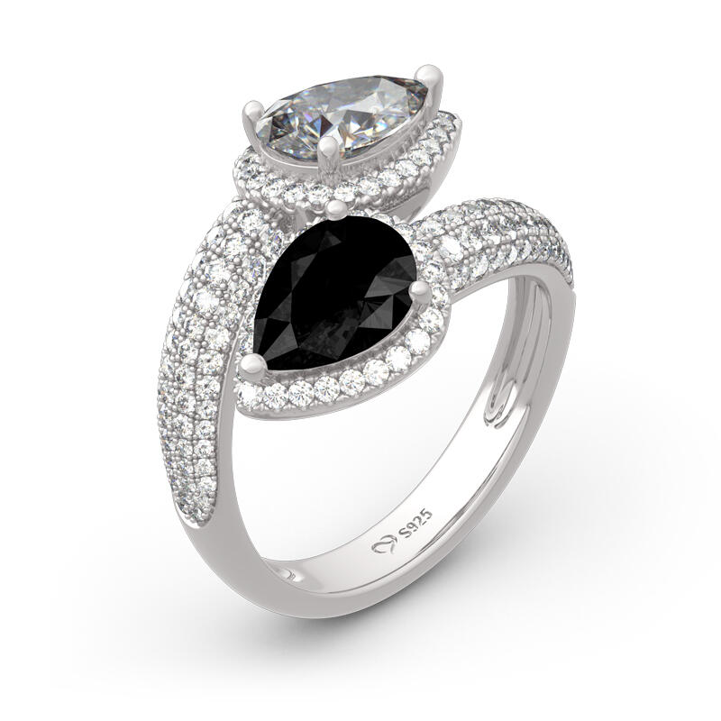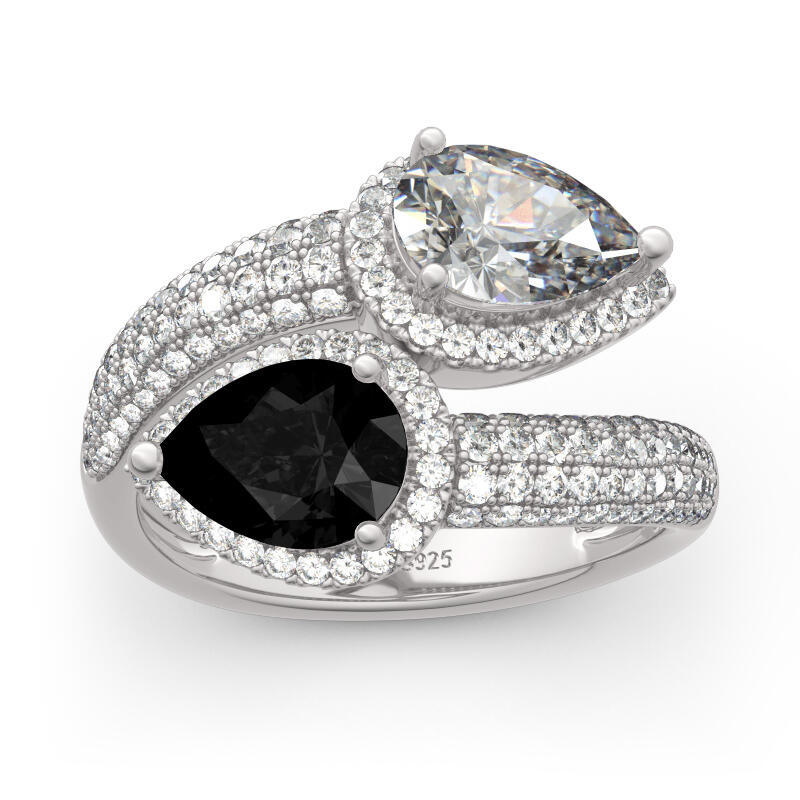 Elegant and unique, this ring will capture your heart at first sight! Crafted in sterling silver, the ring features two pear-cut stones set above a intertwined shank with two polished ribbons.With the glistening round stones paved on the shank, the ring will show a very sparkling and beautiful look on your finger. Treat yourself a holiday gift with this masterpiece!