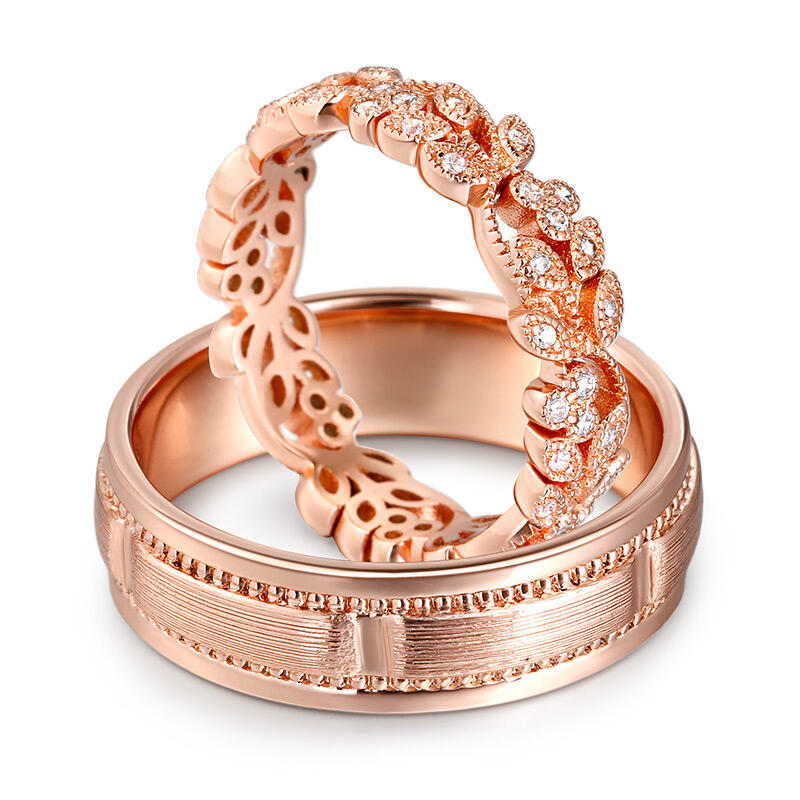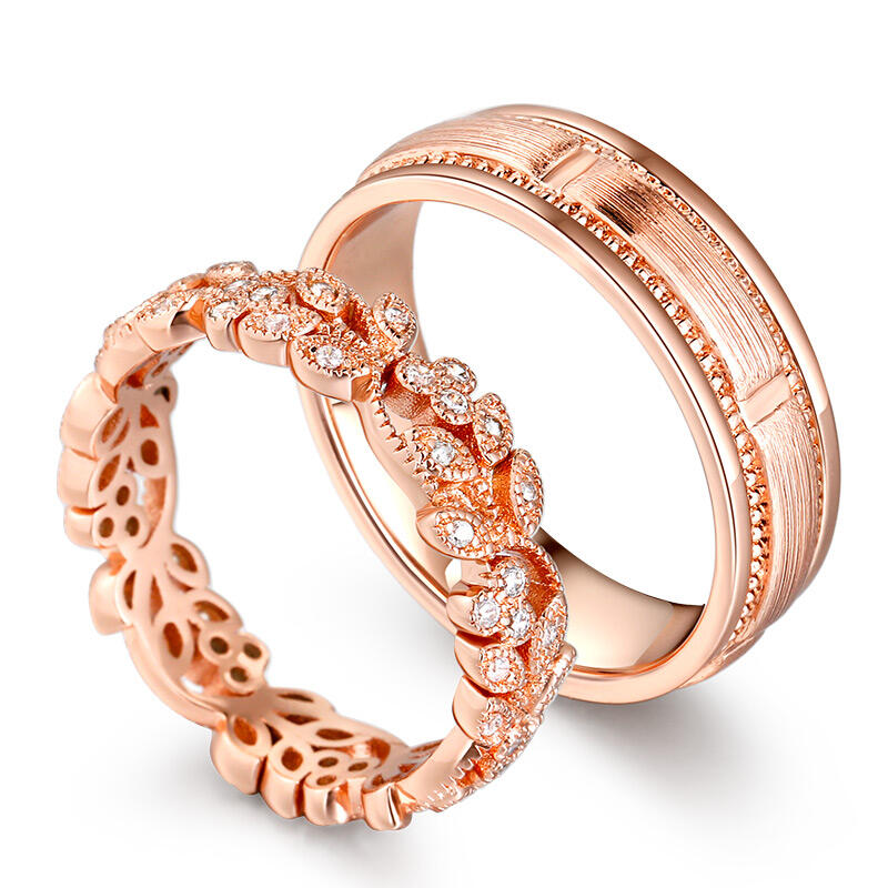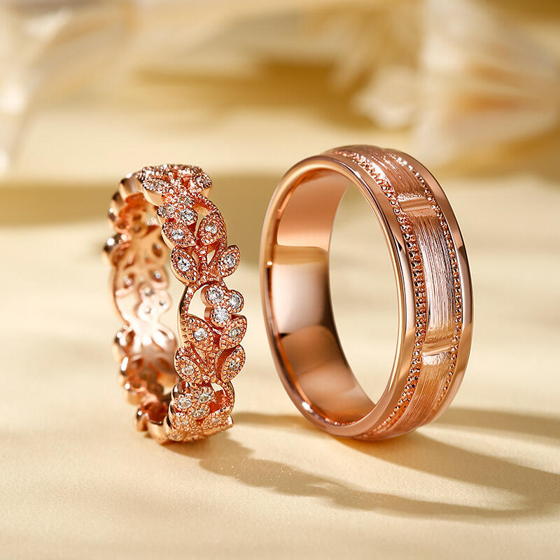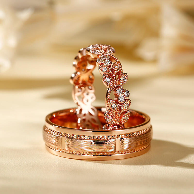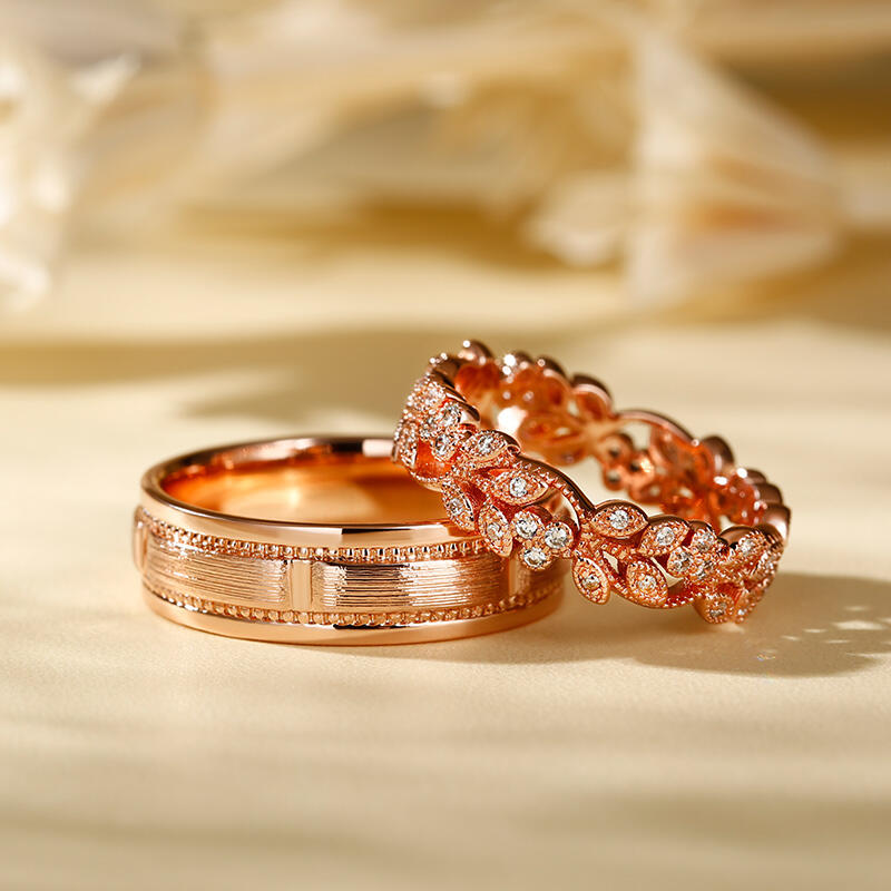 A beloved nature symbol, the leaf depicts the sweetness and wonder of love. The women's band features gentle floral and leaf pattern, while small white stones adorn the band to make a sparkling look. The men's band showcases a stylish matte finish with milgrain details. It is a great jewelry gift to express love, witness your love, romantic and sweet.