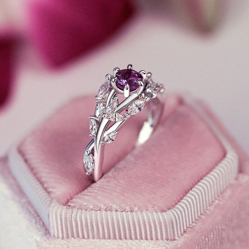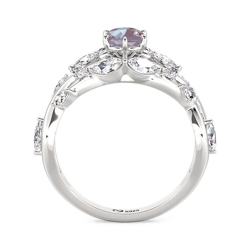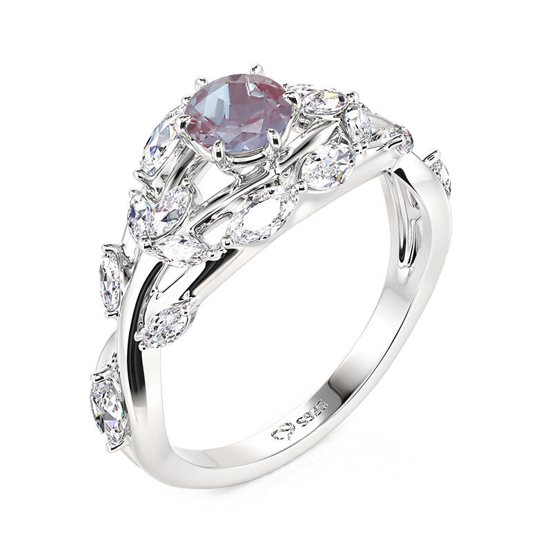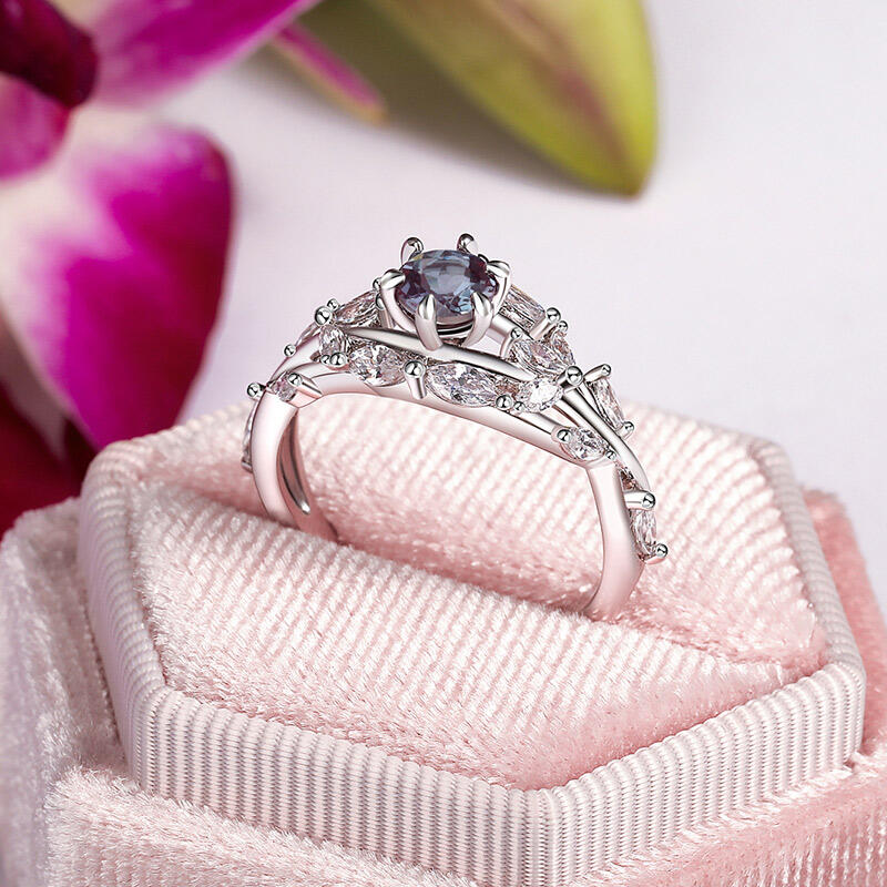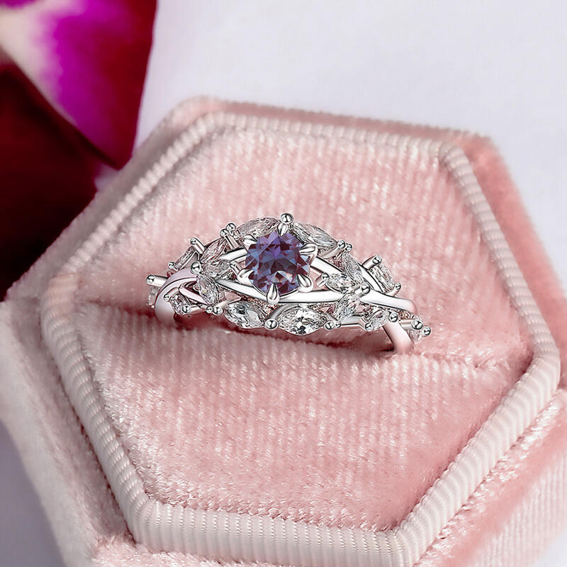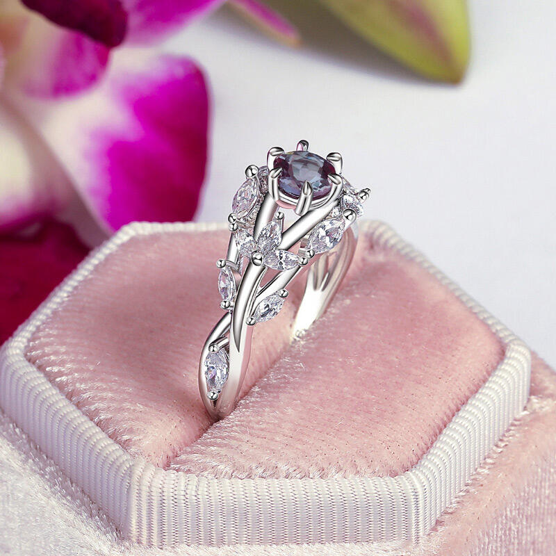With the sparkling alexandrite as its core, this special alexandrite engagement ring's changing colors seem to be the embodiment of emotion, displaying deep and rich layers as the light changes. This sterling silver alexandrite ring arm is designed with elegant flower and leaf elements, with detailed carvings complementing the smooth curves, like a bouquet of flowers containing the scent of love, lingering on your fingertips, just like the never-fading romance between you and your beloved.