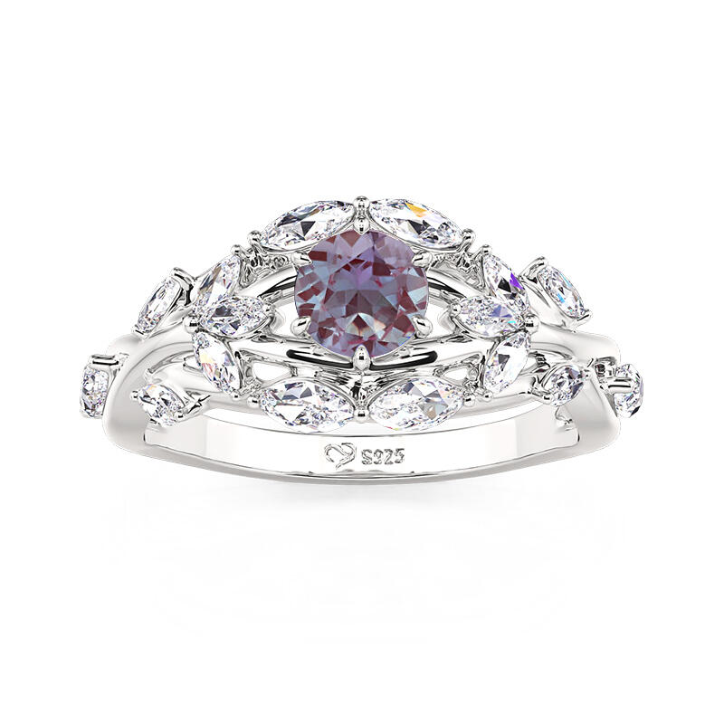Jeulia Flower&Leaf Alexandrite Ring Round Cut Sterling Silver