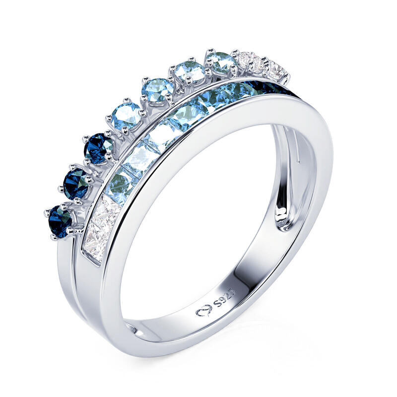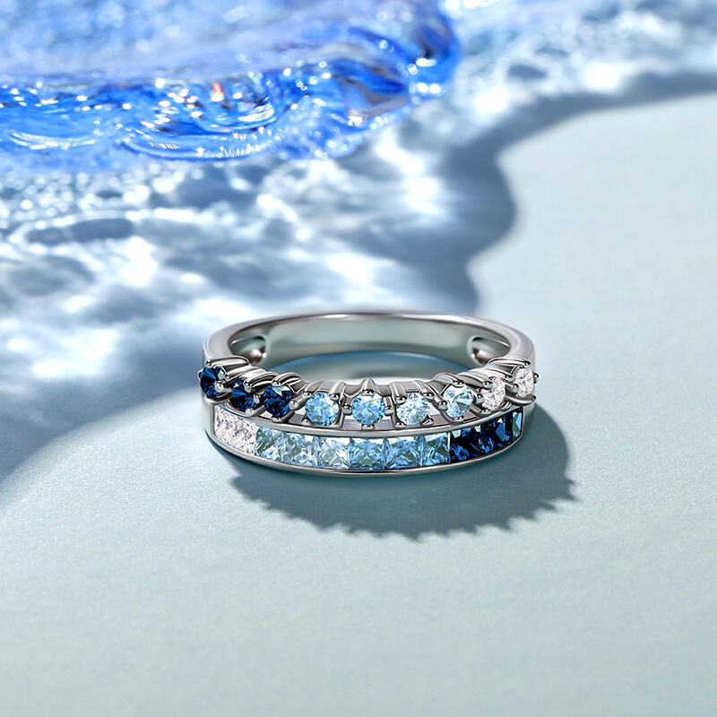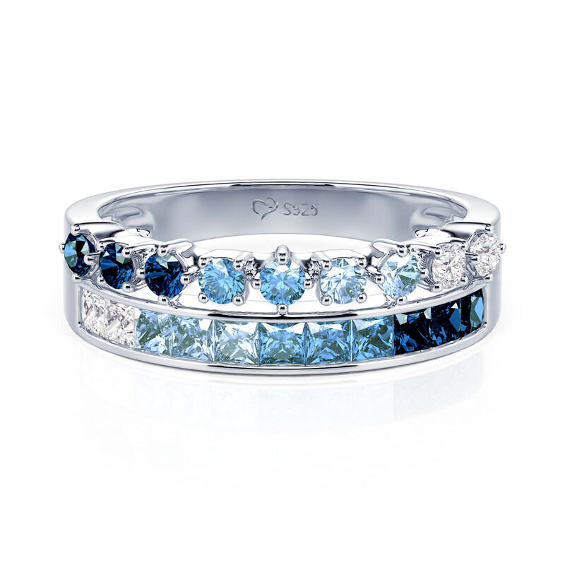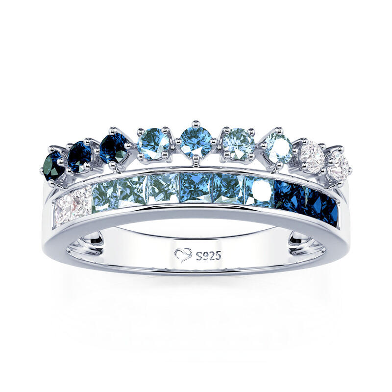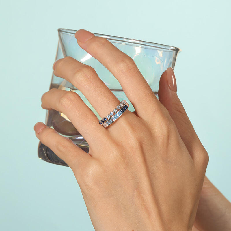 Inspired by the ocean's beauty in summer, this Jeulia stunning gradient double row eternity band ring showcases a mesmerizing blue gradient effect. Crafted from high-quality sterling silver, this eternity ring showcases a dual-row design adorned with an array of blue stones that evoke the serene hues of the sea. The blend of different shades of blue creates a mesmerizing visual impact, reminiscent of gentle waves and clear skies. Each stone is carefully set to enhance the ring's brilliance, making it a perfect statement piece for any occasion. Whether worn as a standalone accessory or stacked with other rings, this eternity band embodies elegance and individuality. Celebrate your love for the ocean and the vibrant spirit of summer with the Jeulia Gradient Double Row Eternity Band Ring—a timeless piece that will add a splash of color and charm to your collection.