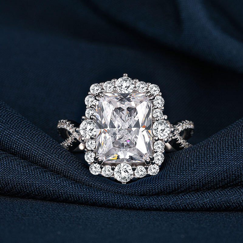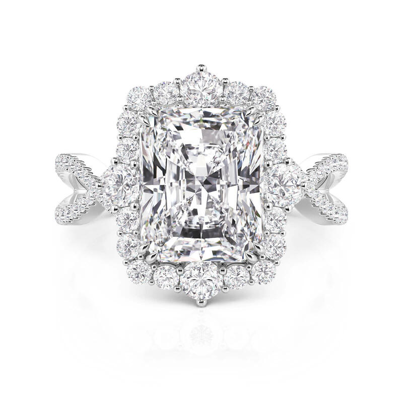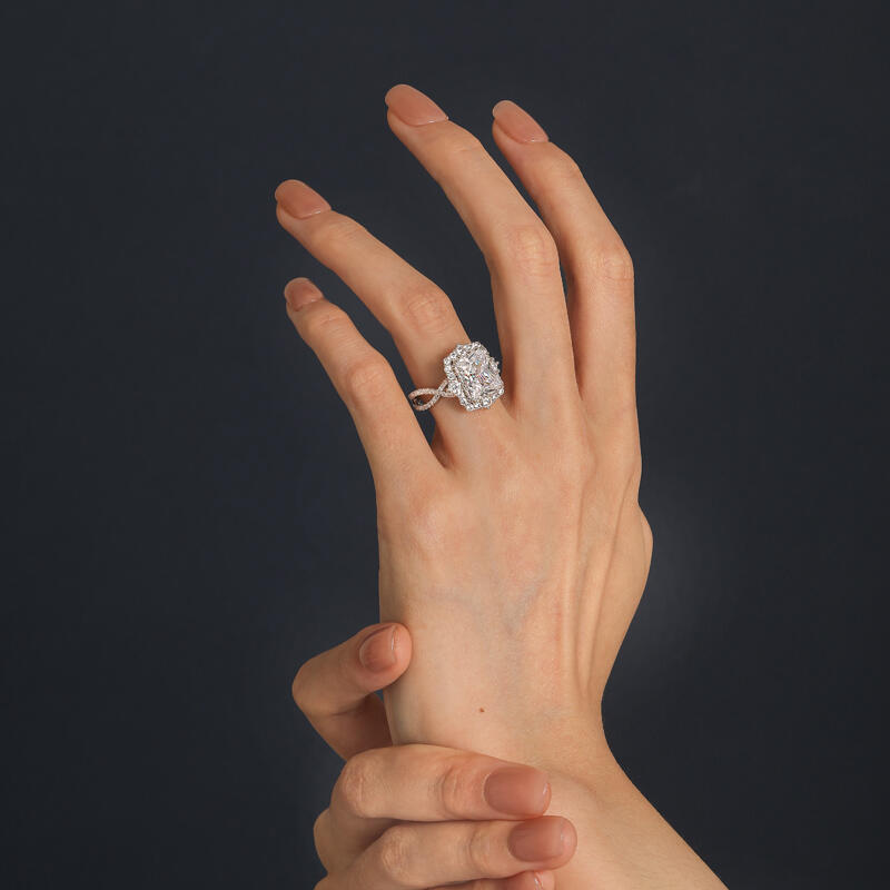 The Jeulia halo twist radiant cut engagement ring is a stunning symbol of love and commitment. This exquisite twist engagement ring features a breathtaking radiant-cut center stone, surrounded by a dazzling halo of sparkling diamonds that create a captivating brilliance. The elegant twist design of the band adds a modern touch, beautifully intertwining sophistication with timeless romance. Crafted from high-quality sterling silver, this halo engagement ring not only offers durability but also showcases an everlasting shine. Perfect for your special moment, this halo radiant cut engagement ring is a celebration of your unique love story. Let this halo twist engagement ring be a cherished emblem of your journey together, shining brightly on your path to forever.