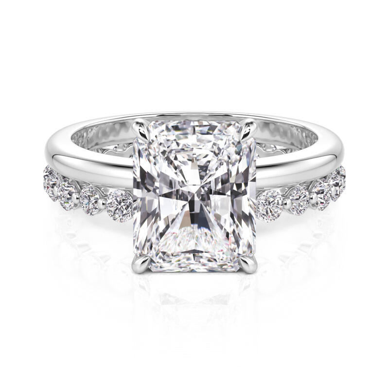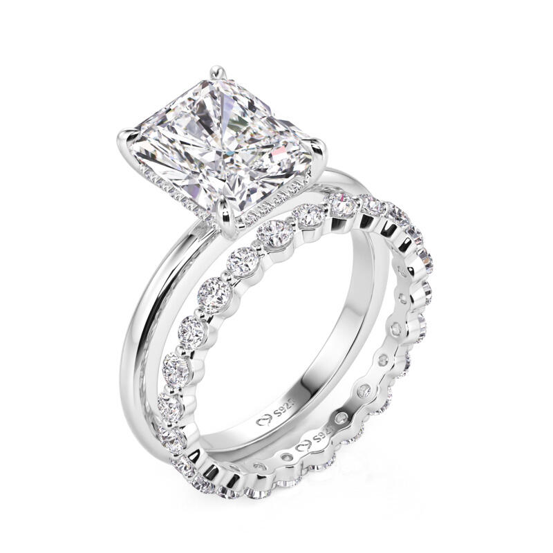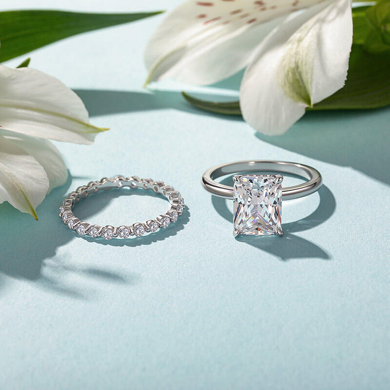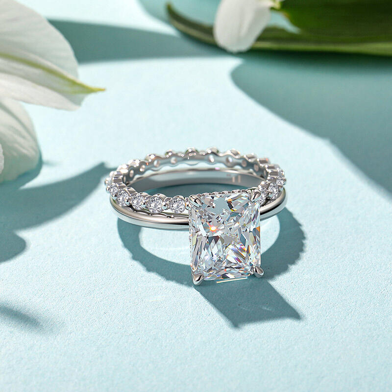This Jeulia Hidden Halo princess-cut engagement ring set is crafted from 925 sterling silver. The main ring features a classic princess-cut center stone paired with an innovative hidden halo design. The ring shank is adorned with meticulously arranged pave-set diamonds that only reveal their dazzling halo effect when light refracts, offering a subtle yet surprising touch. The secondary ring features a minimalist pave-set diamond band design. When worn together with the main ring, it highlights the brilliance of the main stone while maintaining an elegant balance in the overall design. This classic engagement ring set is perfectly suited for various occasions—the sudden appearance of the hidden halo during the proposal brings an unexpected romantic surprise, the clean lines of the princess-cut stone complement the wedding dress during the ceremony, and the hidden design exudes understated luxury when worn daily.