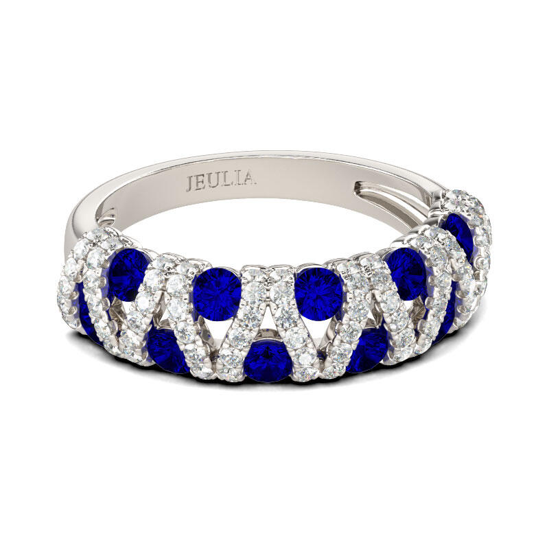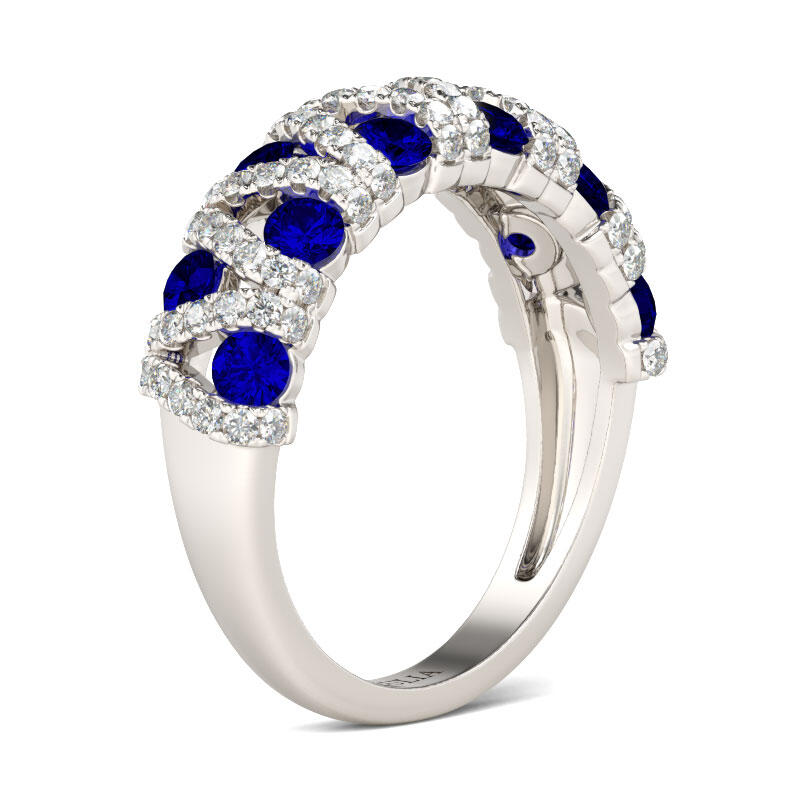 Unique and stunning, this wedding band will capture your heart at first sight. Crafted in sterling silver, this band is sculptured in a round edge for comfort of wear. Glistening white and sapphire blue stones are set on the shank to show a sparkling look. Treat yourself or surprise her with this piece.