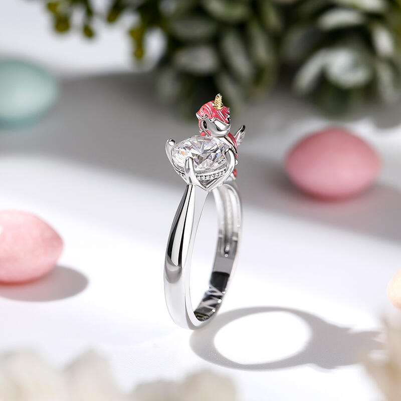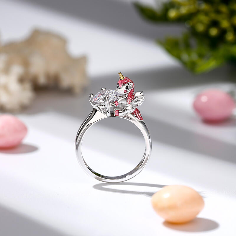 Unicorn ring, sprinkle some magic into the lives with smiles and fairy tales. Unicorn inspired things can help us save and nurture that part, bring back nostalgia from long-lost childhood days. Having dreams and imagination make us believe in a better world, even in things we haven't seen yet. Give your finger a sweet hug with this lovely pink unicorn ring. Crafted in sterling silver, this ring in Hug Me® collection features a shimmering round cut stone hugged by a little unicorn. You will find more adorable and creative designs in our Hug Me® collection.