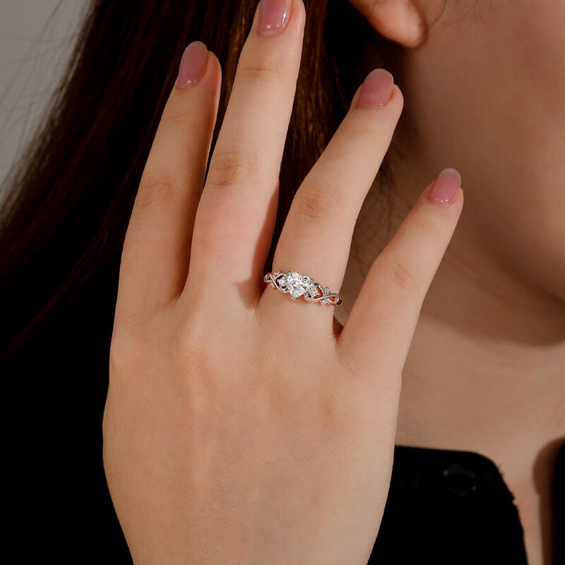 This Jeulia heart-shaped infinity engagement ring is crafted from 925 sterling silver. The heart-shaped center stone features an improved cutting technique, while the ring band is designed in the shape of an infinity symbol. The intertwined double rings wrap around the finger, symbolizing endless love. The infinity symbol is adorned with sparkling small stones, resembling a starry sky surrounding the main stone. When worn, the heart-shaped main stone refracts different hues as it rotates with the angle, while the stones on the infinity symbol twinkle with delicate starlight as they move. Whether during the heartfelt moment of proposing on one knee or in everyday gestures, this infinity heart ring radiates captivating brilliance.