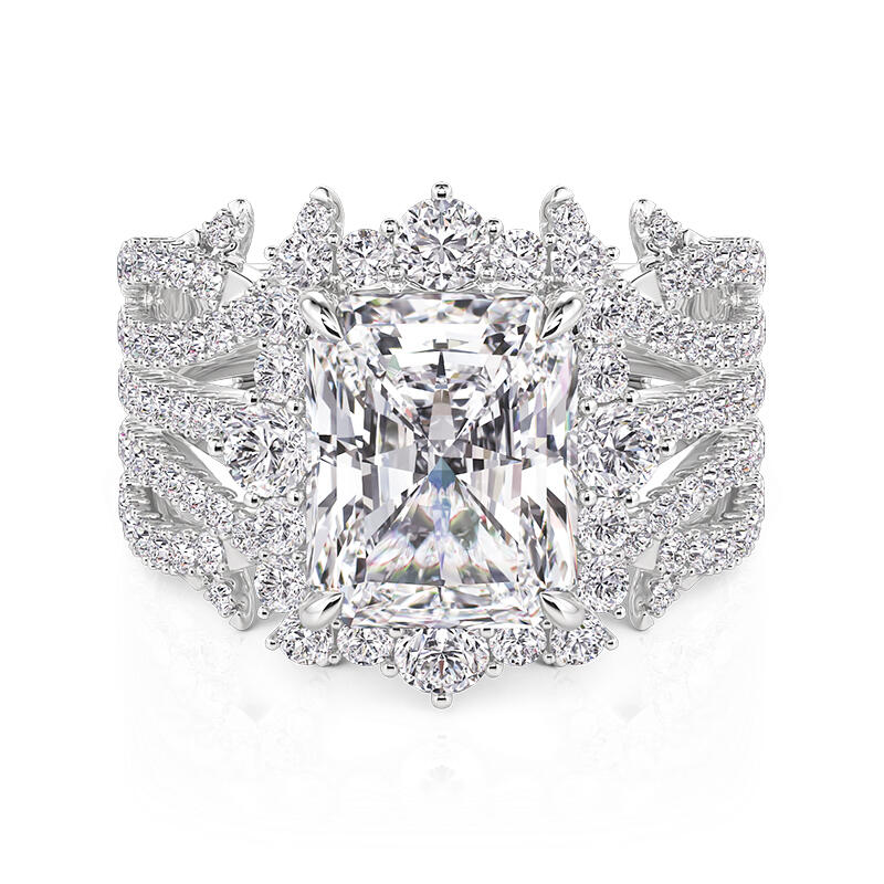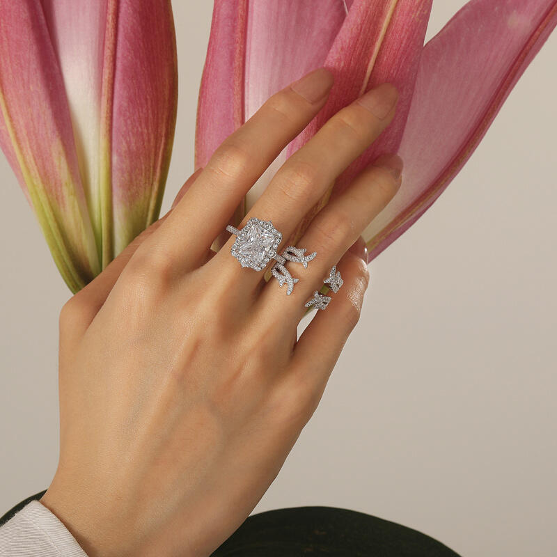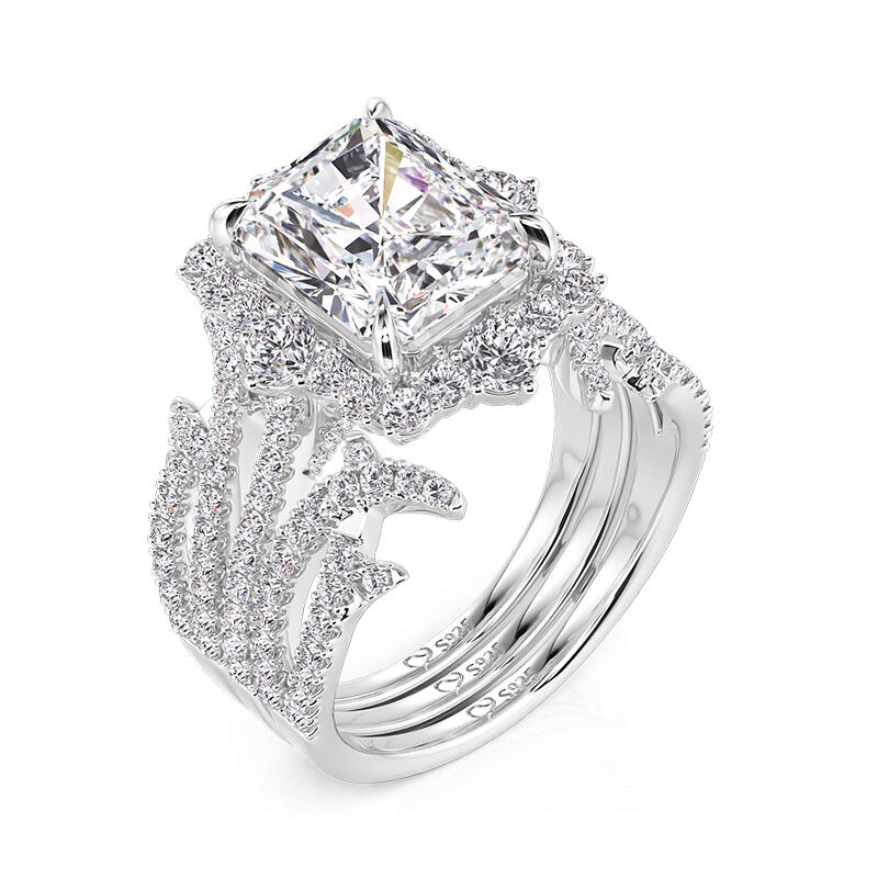 Jeulia twist ring set with a radiant-cut solitaire blazes within a halo of tapered daggers, their sharp angles sheathed by a thorned enhancer band. The thorns, plated in oxidized silver, curl protectively around the central stone—a juxtaposition of softness armored in rebellion. Stack the halo ring set to let the daggers pierce through the enhancer’s gaps, or wear the solitaire alone, its brilliance unapologetic as sunlight through shattered glass.