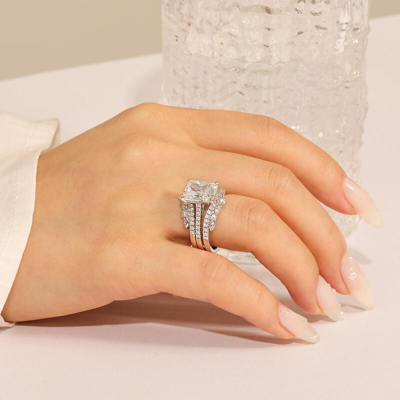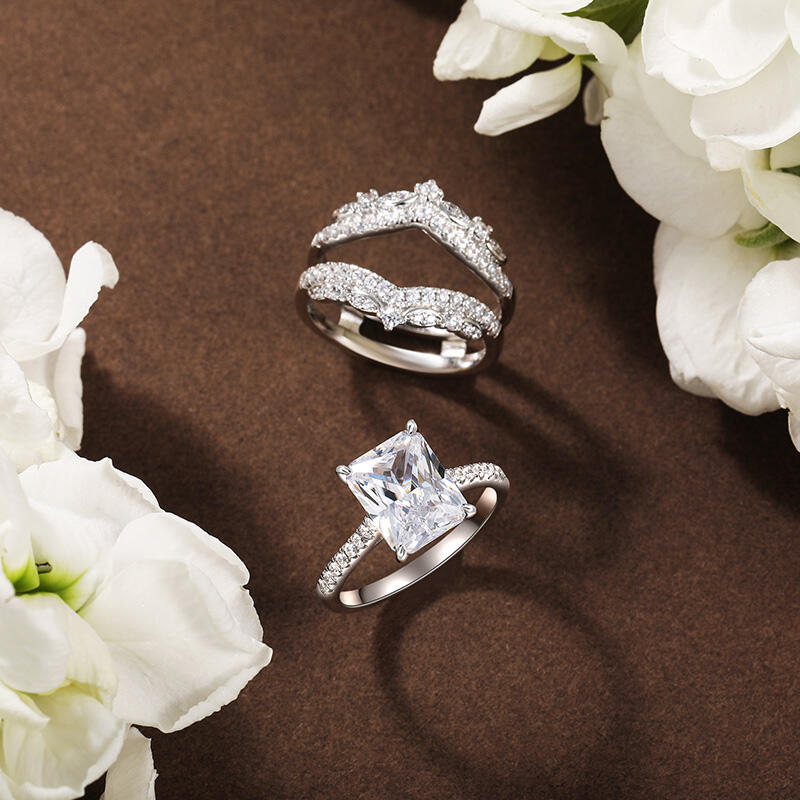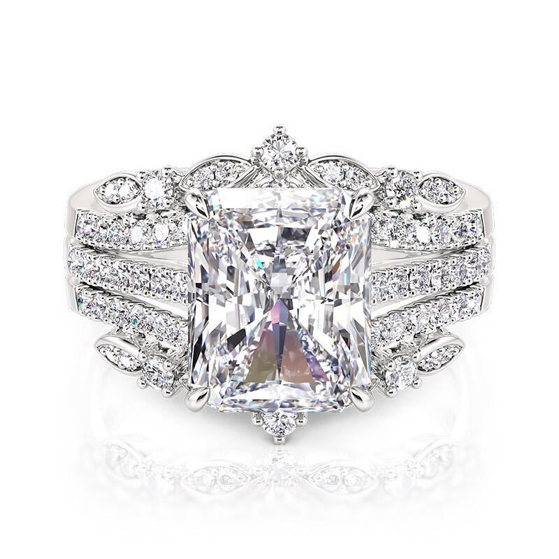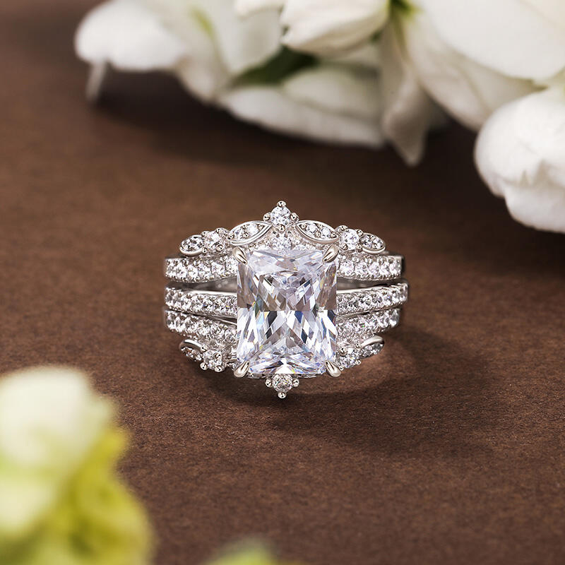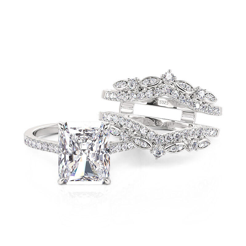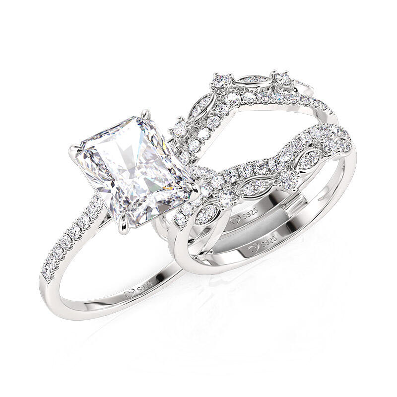 Inspired by the elegance of romantic classical design, this exquisite interchangeable eternity ring set captures the heart with its radiant centerpiece. At its heart lies a Radiant Cut main stone, masterfully cut to showcase unparalleled clarity and brilliance, casting a mesmerizing glow. Encircled by a constellation of shimmering smaller stones, like stars scattered across a midnight sky, it exudes a soft yet dazzling splendor. The refined metal silhouette, adorned with delicate detailing, not only enhances the ring's inherent beauty but also reveals the wearer's unique and captivating charm. This romantic classical engagement ring set is more than a piece of jewelry—it is a testament to enduring love and timeless elegance. In the timeless journey of love, there are moments so precious they deserve to be cherished forever.