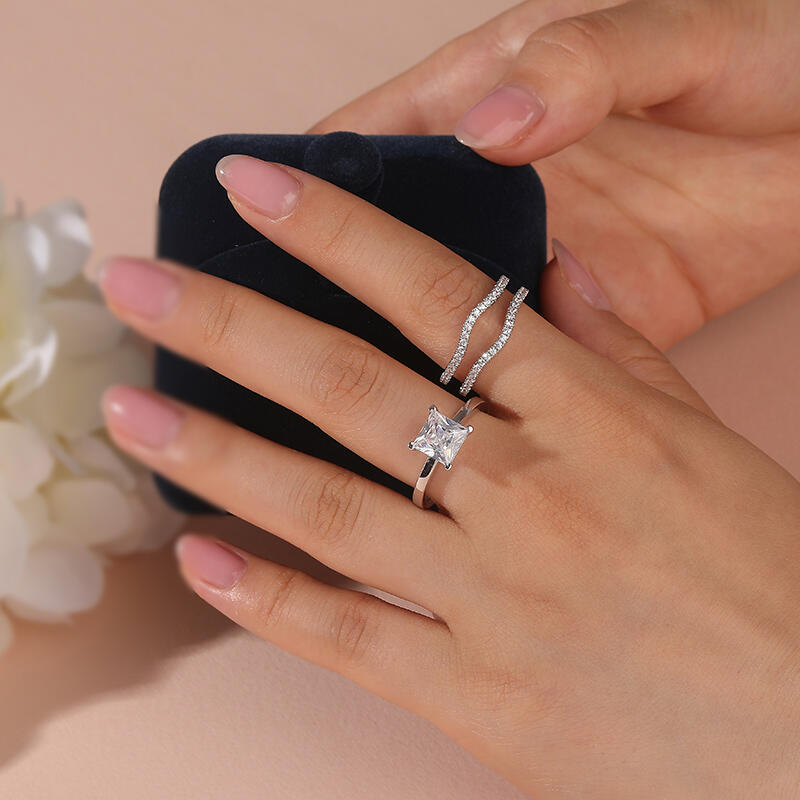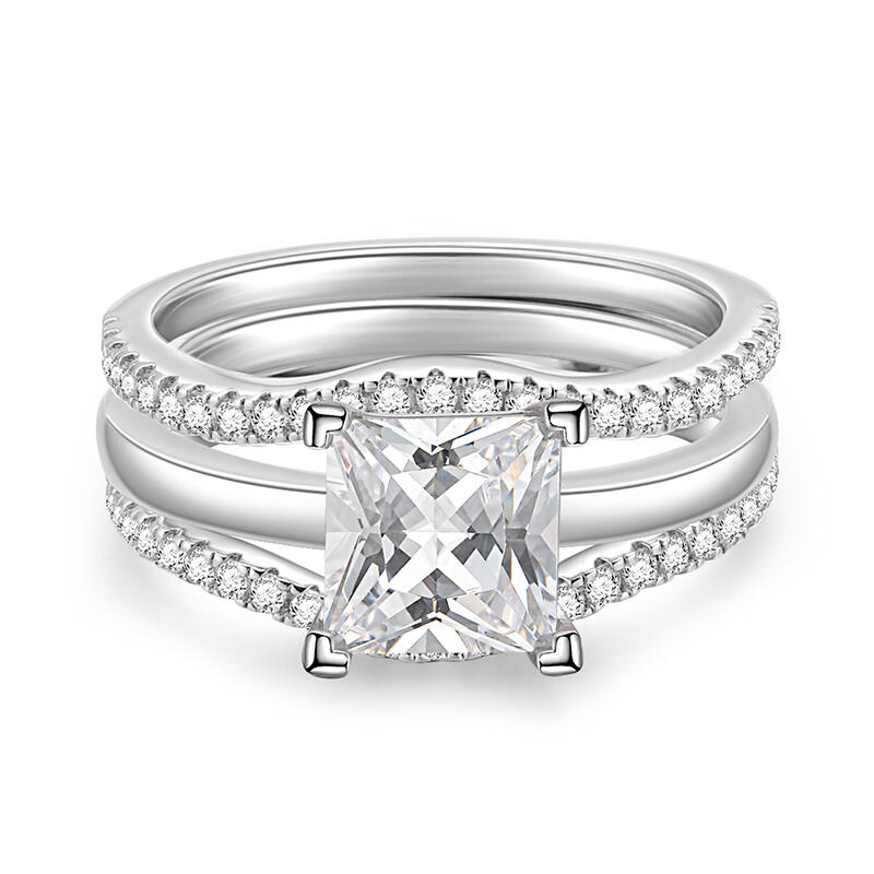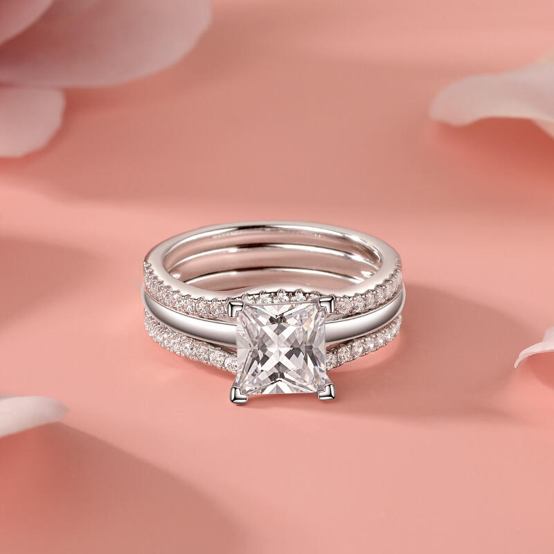 This eye-catching interchangeable princess cut engagement ring set by sterling silver features an enchanting radiant cut stone. Pave detailing on the engagement ring setting adds depth and dimension to this elegant design. The center band features an elegant princess-cut stone for a captivating glow. This slender wedding ring set will sparkle with your affection and is a true testament to your everlasting love.