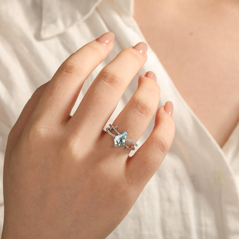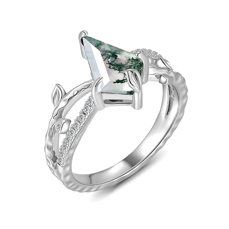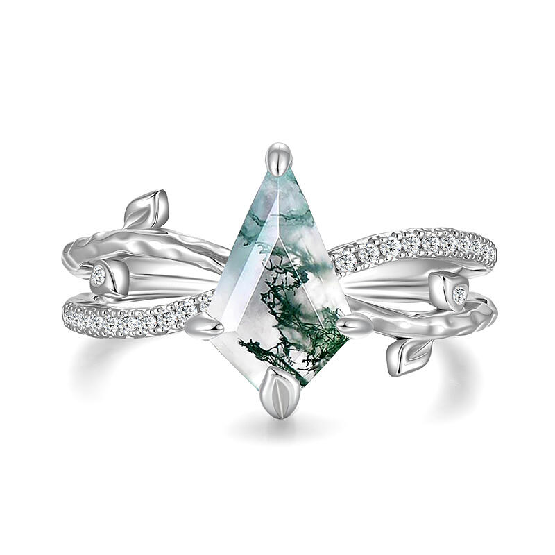 This Jeulia Kite Cut Moss Agate Leaf Engagement Ring seamlessly blends natural beauty with unique cutting techniques. The center stone features a distinctive kite-shaped cut moss agate, whose natural patterns resemble a miniature forest landscape, with each stone being one-of-a-kind. The ring band incorporates natural leaf and branch elements, with delicate, three-dimensional vein patterns that seem to capture the vitality of the forest right on your finger. The design symbolizes purity and growth, making this moss agate ring an ideal choice for a meaningful engagement ring or for wearing on anniversaries and special occasions, showcasing the wearer's unique connection to nature.