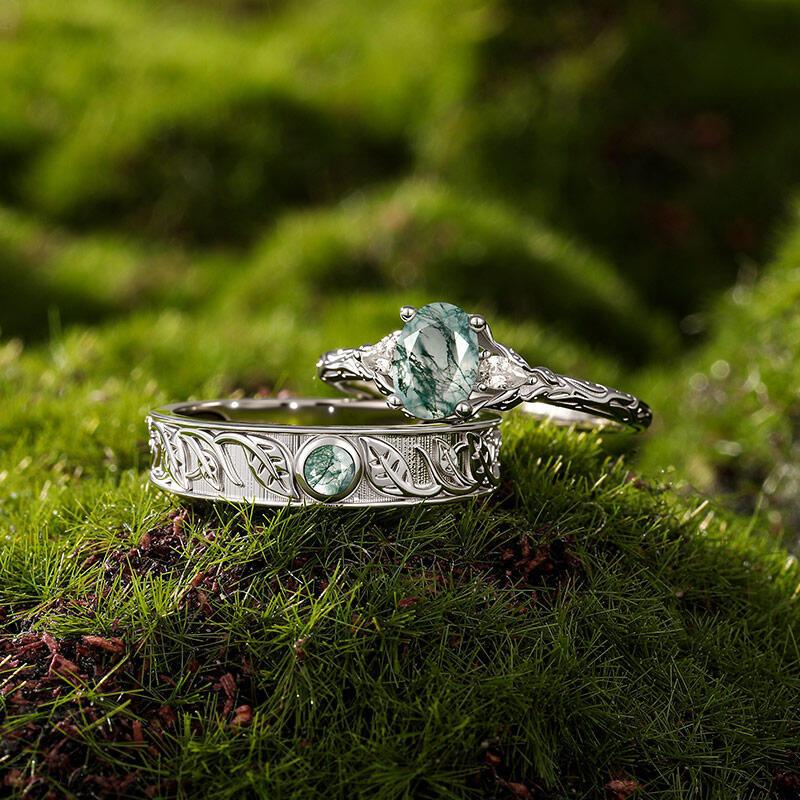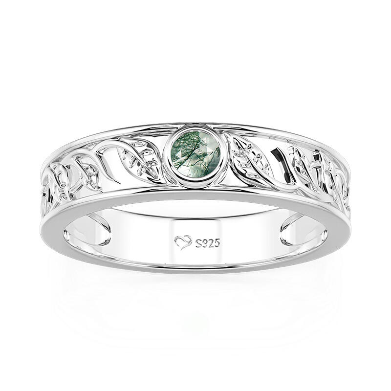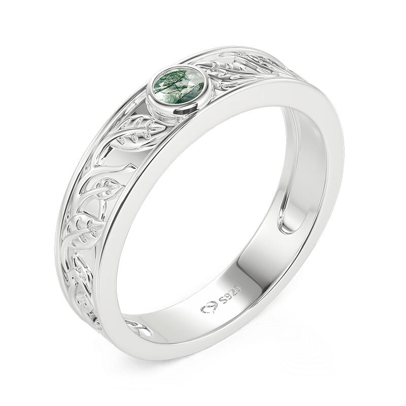 This Jeulia Moss Agate Wedding Band for Men features frosted silver band etched with leaf veins so precise that they replicate real oak growth rings under magnification. A moss agate cabochon nests flush at center, its dendritic patterns echoing the engraved foliage—one part forest floor, one part celestial nebula. Width calibrated to 5mm: substantial enough for rough hands, refined enough for boardroom vows.