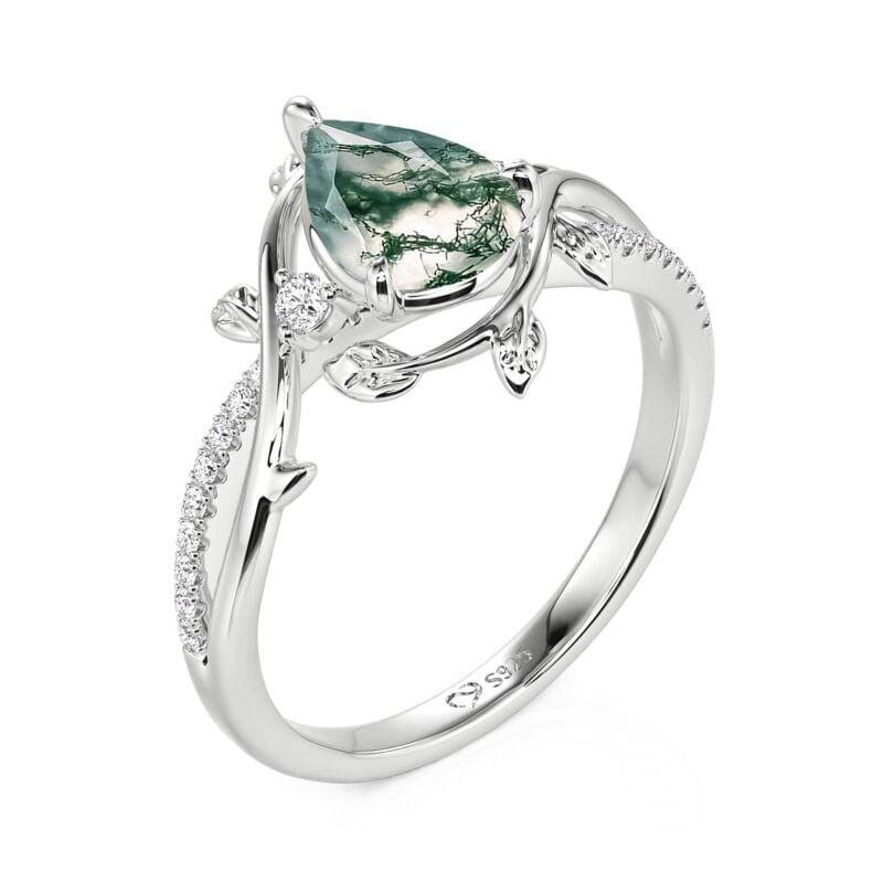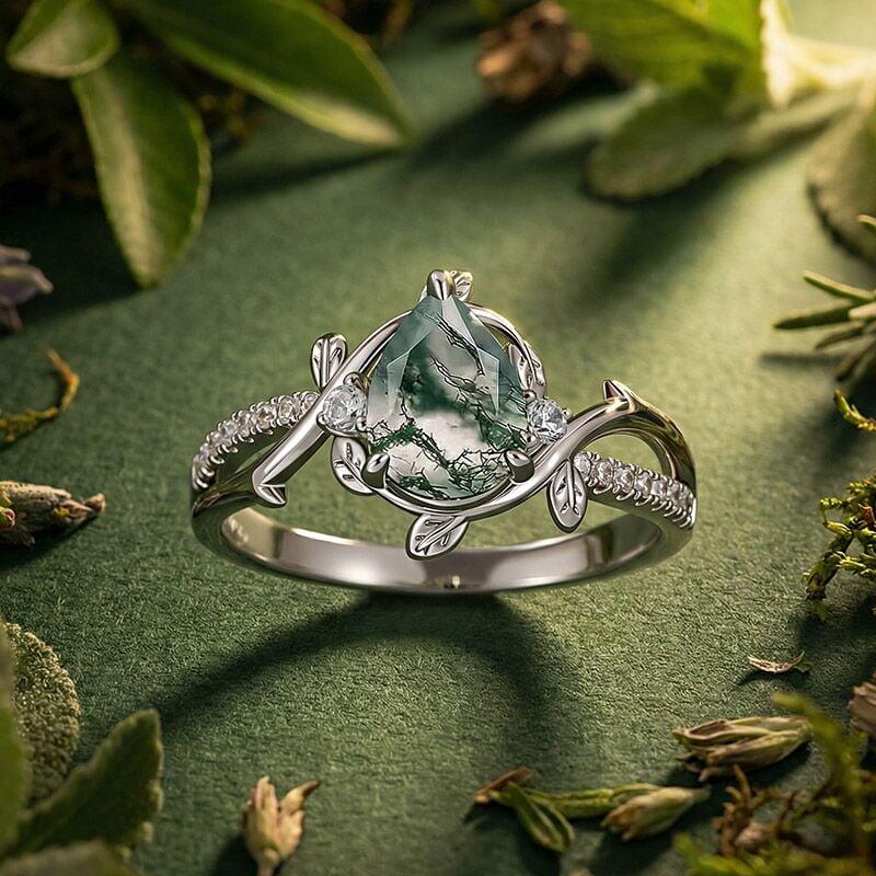 Crafted with meticulous artistry from sterling silver, this Jeulia Leaf Twist Pear Shaped Moss Agate Engagement Ring poetically blends a pear-shaped natural gemstone with the organic imagery of twisted leaves. The center stone is a pear-cut moss agate, whose natural bluish-gray misty patterns evoke the mysterious atmosphere of a forest shrouded in morning fog when caught in the light—each stone is truly one-of-a-kind. The ring shank features a dynamic twisted design that outlines intertwining leaves and vines; the flowing, graceful lines of the vines gently cradle the center stone, as if it were a treasure guarded by the forces of nature. The overall design brims with organic vitality and a distinctive artistic flair, perfect for couples who seek natural aesthetics and personal expression. This leaf engagement ring allows love to settle like moss over time and grow like vines through the years, becoming a wearable, eternal ode to nature.